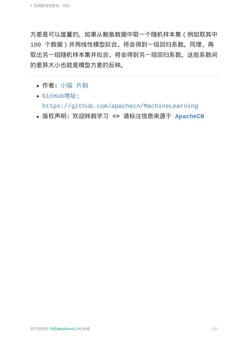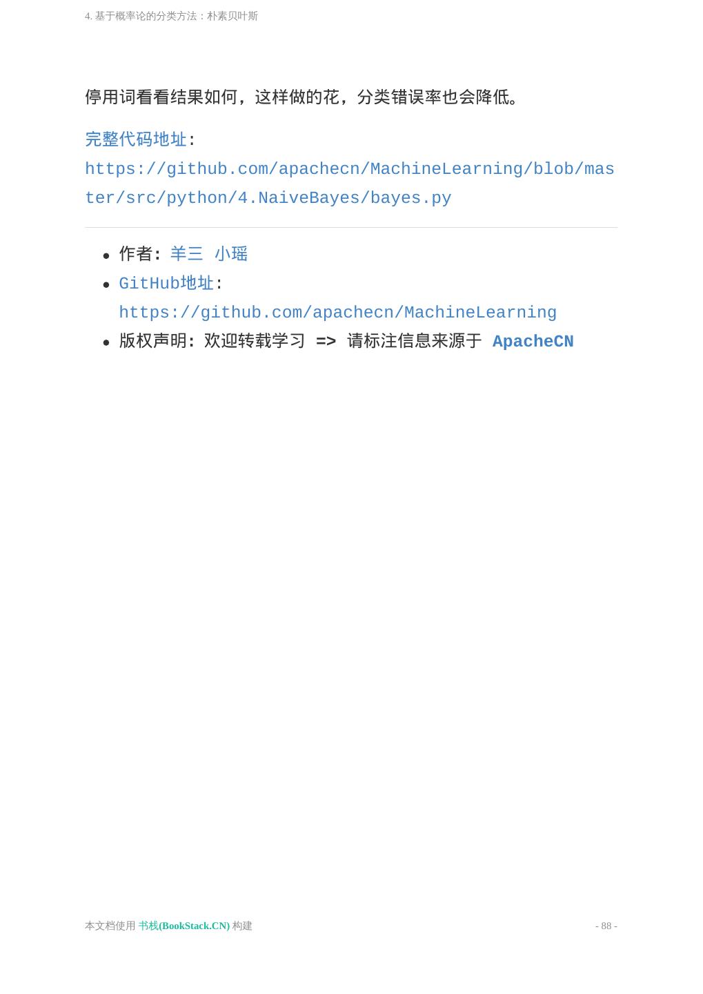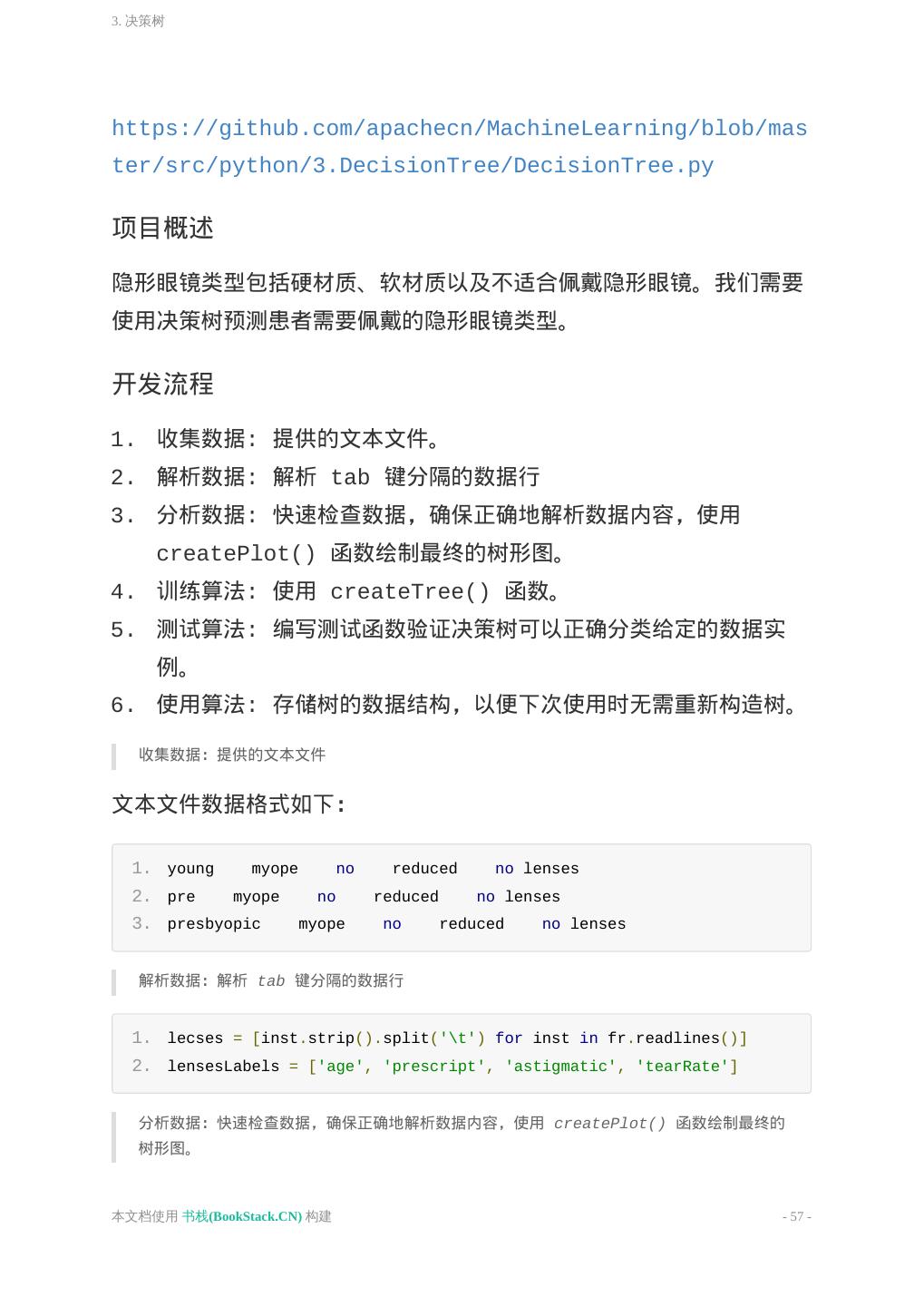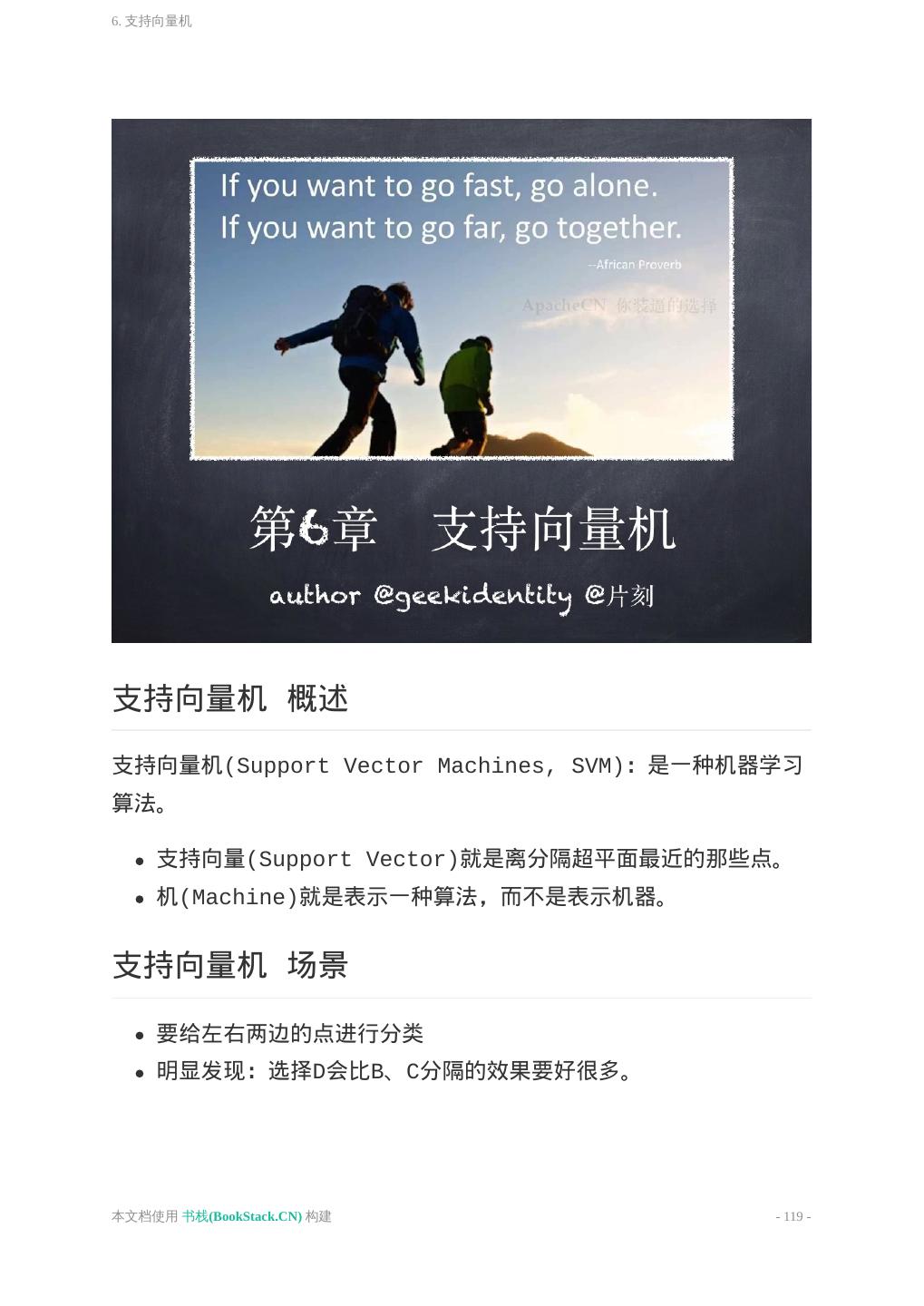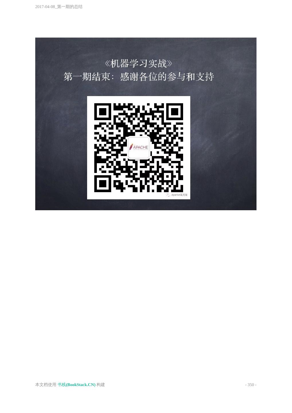 2 .致谢 致谢 当前文档 《机器学习实战(Machine Learning in Action)》 由 进击的皇虫 使用 书栈(BookStack.CN) 进行构 建,生成于 2018-02-16。 书栈(BookStack.CN) 仅提供文档编写、整理、归类等功能,以 及对文档内容的生成和导出工具。 文档内容由网友们编写和整理,书栈(BookStack.CN) 难以确认 文档内容知识点是否错漏。如果您在阅读文档获取知识的时候,发现文 档内容有不恰当的地方,请向我们反馈,让我们共同携手,将知识准 确、高效且有效地传递给每一个人。 同时,如果您在日常生活、工作和学习中遇到有价值有营养的知识 文档,欢迎分享到 书栈(BookStack.CN) ,为知识的传承献上您的 一份力量! 如果当前文档生成时间太久,请到 书栈(BookStack.CN) 获取 最新的文档,以跟上知识更新换代的步伐。 文档地 址:http://www.bookstack.cn/books/MachineLearning 书栈官网:http://www.bookstack.cn 书栈开源:https://github.com/TruthHun 分享,让知识传承更久远! 感谢知识的创造者,感谢知识的分享 者,也感谢每一位阅读到此处的读者,因为我们都将成为知识的传承 者。 本文档使用 书栈(BookStack.CN) 构建 - 2 -