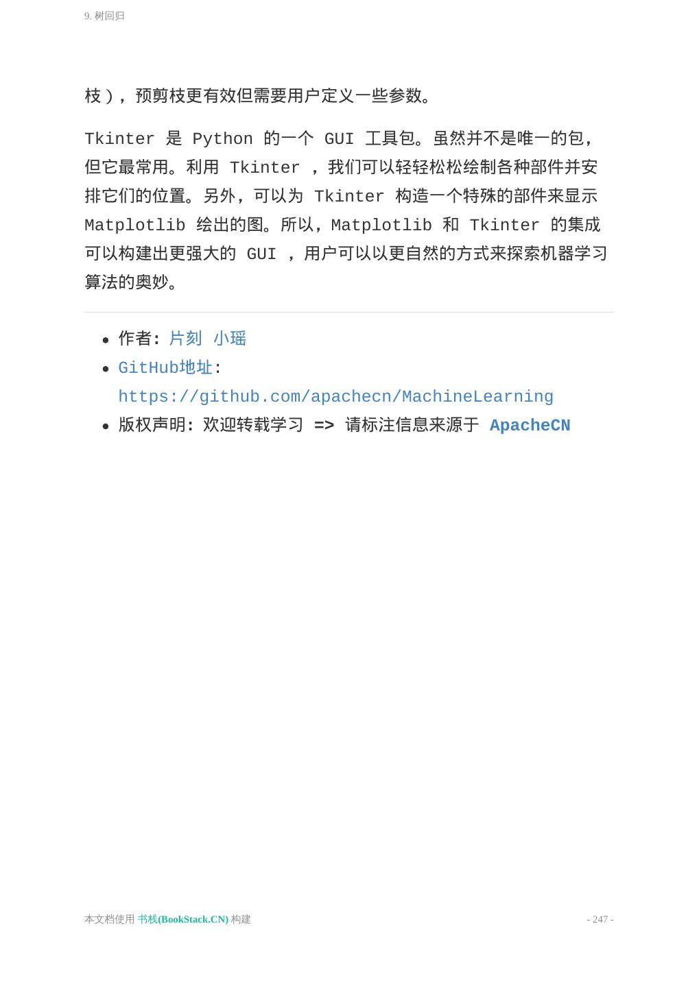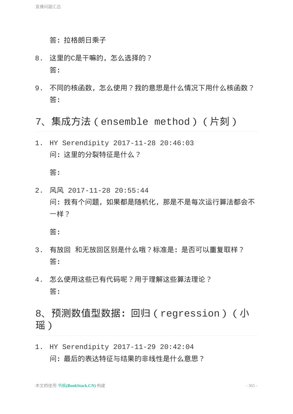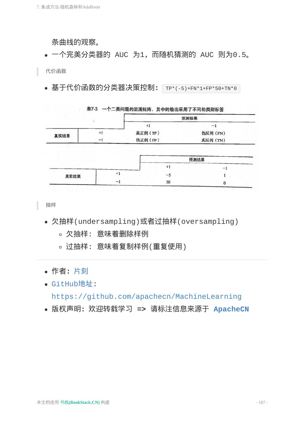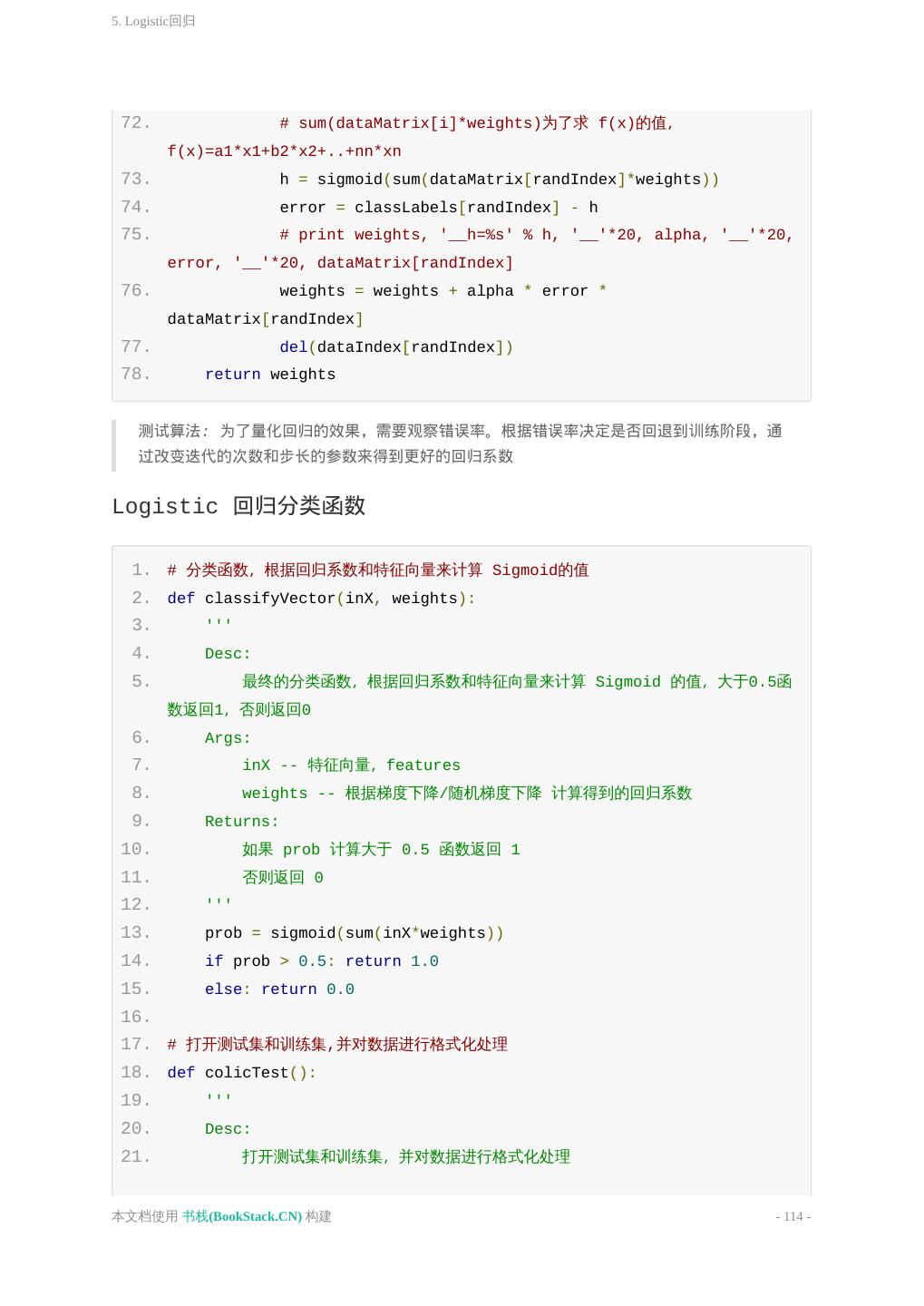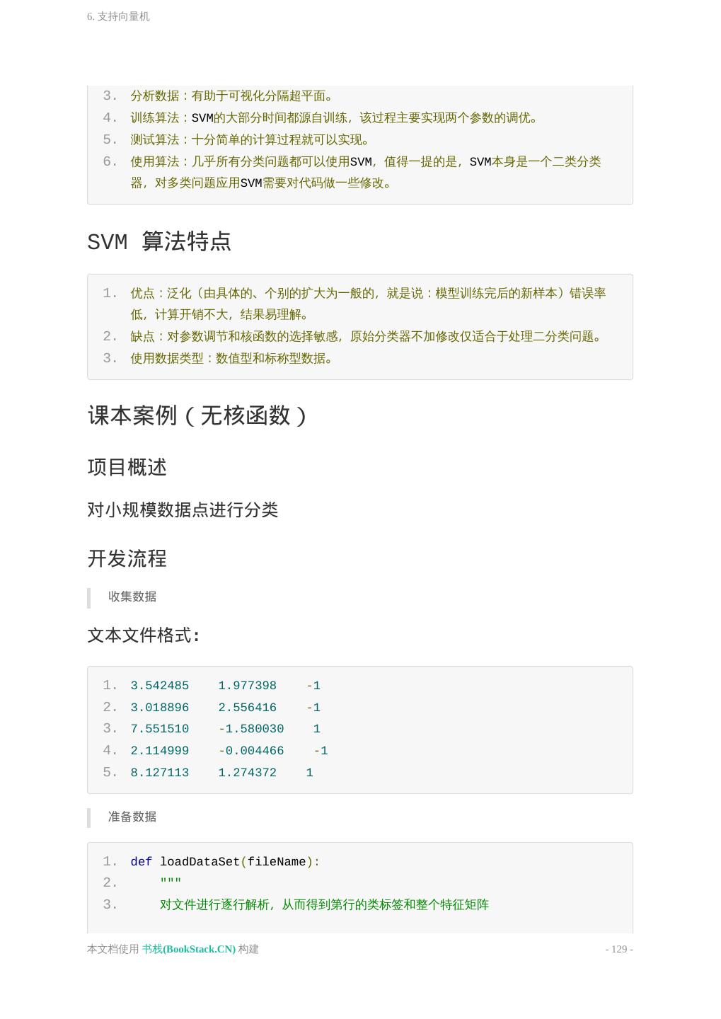 2 .致谢 致谢 当前文档 《机器学习实战(Machine Learning in Action)》 由 进击的皇虫 使用 书栈(BookStack.CN) 进行构 建,生成于 2018-02-16。 书栈(BookStack.CN) 仅提供文档编写、整理、归类等功能,以 及对文档内容的生成和导出工具。 文档内容由网友们编写和整理,书栈(BookStack.CN) 难以确认 文档内容知识点是否错漏。如果您在阅读文档获取知识的时候,发现文 档内容有不恰当的地方,请向我们反馈,让我们共同携手,将知识准 确、高效且有效地传递给每一个人。 同时,如果您在日常生活、工作和学习中遇到有价值有营养的知识 文档,欢迎分享到 书栈(BookStack.CN) ,为知识的传承献上您的 一份力量! 如果当前文档生成时间太久,请到 书栈(BookStack.CN) 获取 最新的文档,以跟上知识更新换代的步伐。 文档地 址:http://www.bookstack.cn/books/MachineLearning 书栈官网:http://www.bookstack.cn 书栈开源:https://github.com/TruthHun 分享,让知识传承更久远! 感谢知识的创造者,感谢知识的分享 者,也感谢每一位阅读到此处的读者,因为我们都将成为知识的传承 者。 本文档使用 书栈(BookStack.CN) 构建 - 2 -
