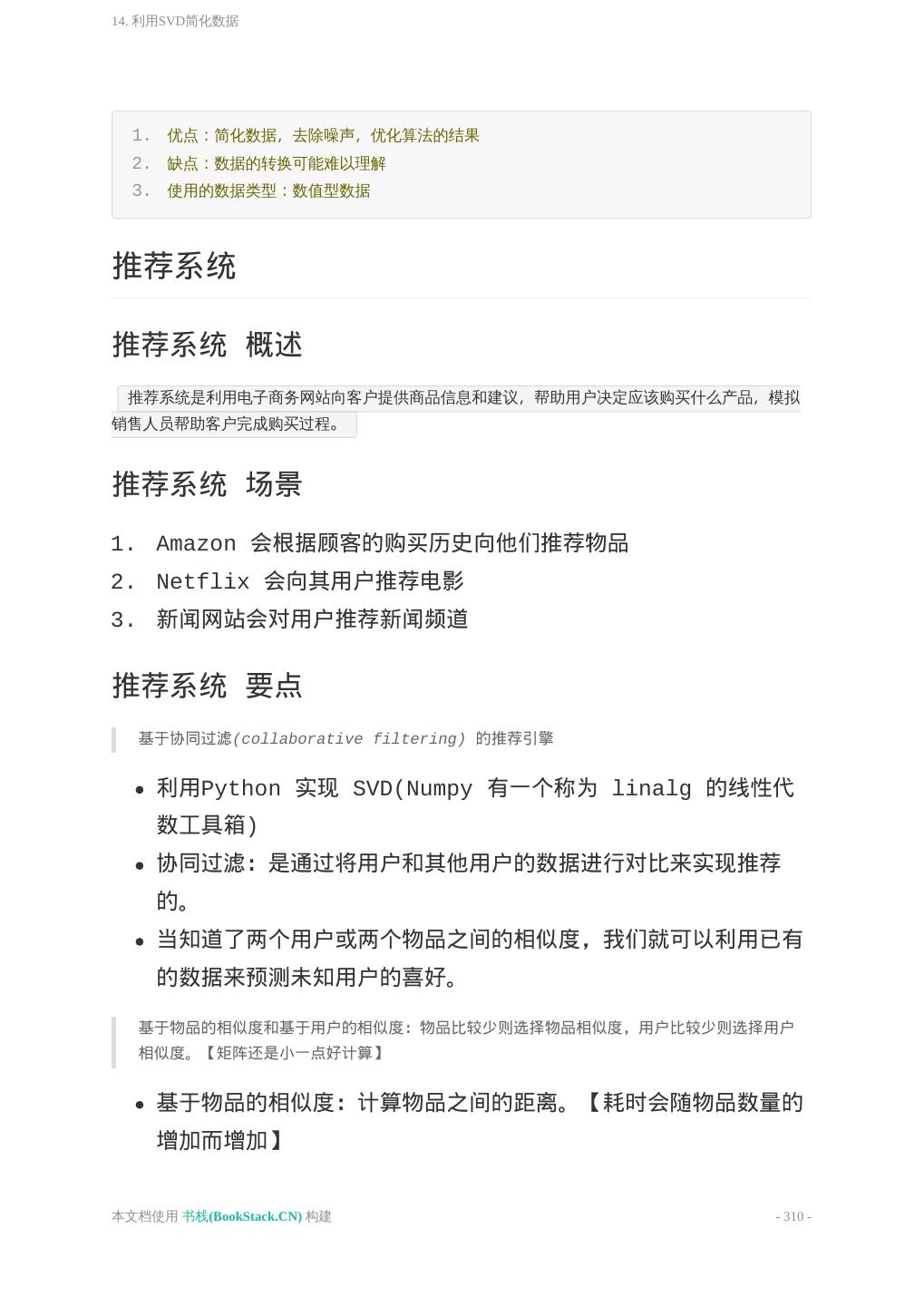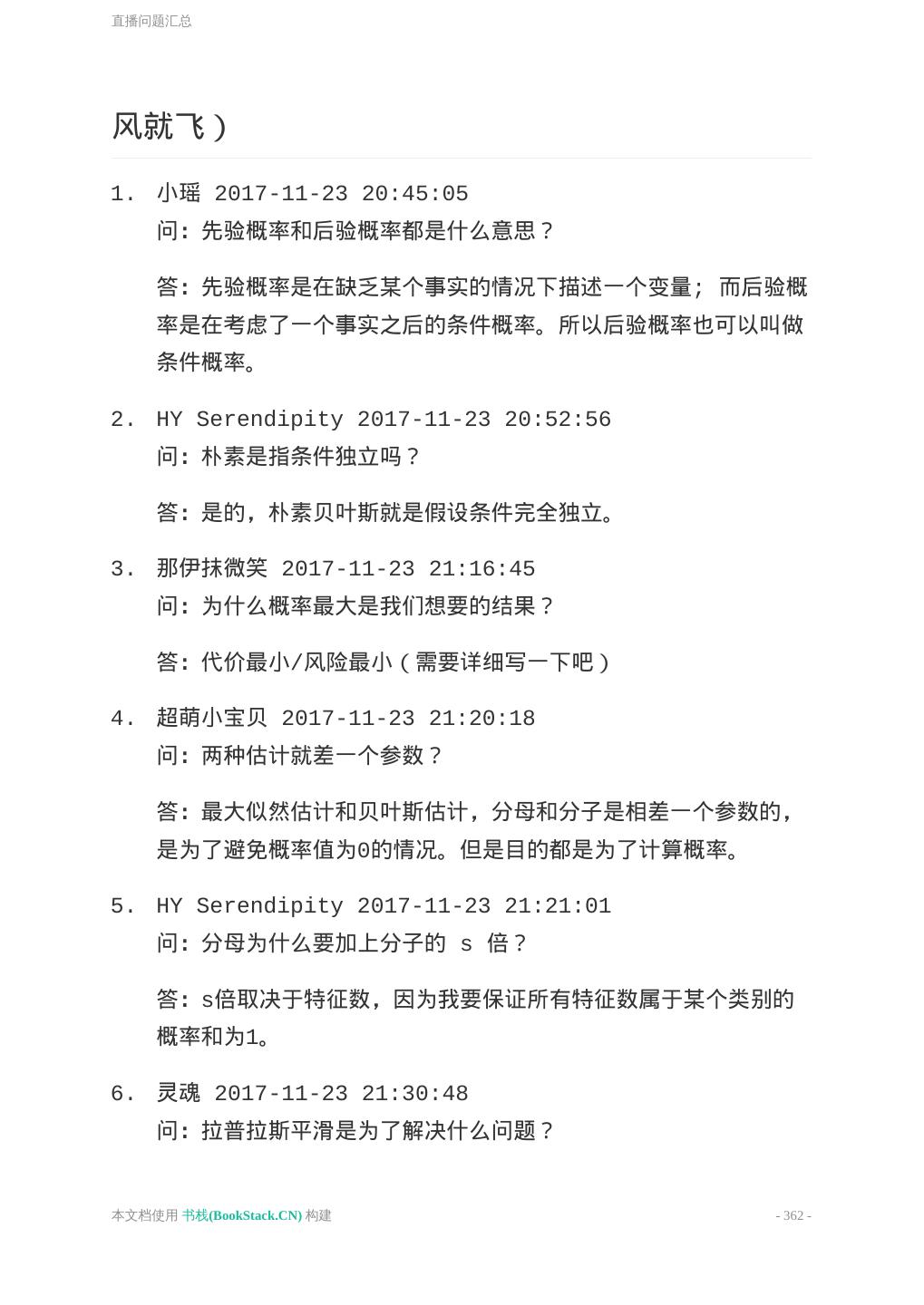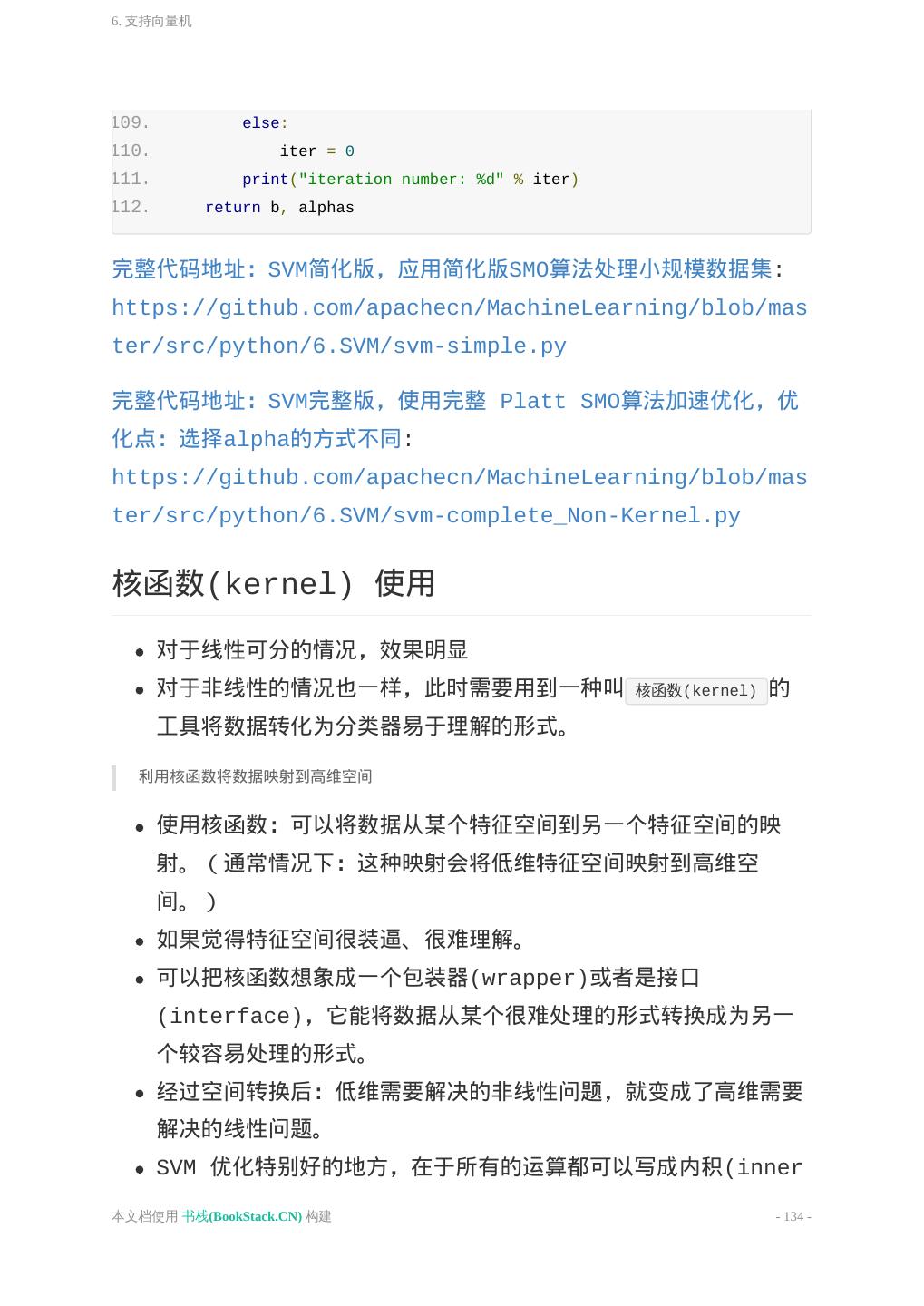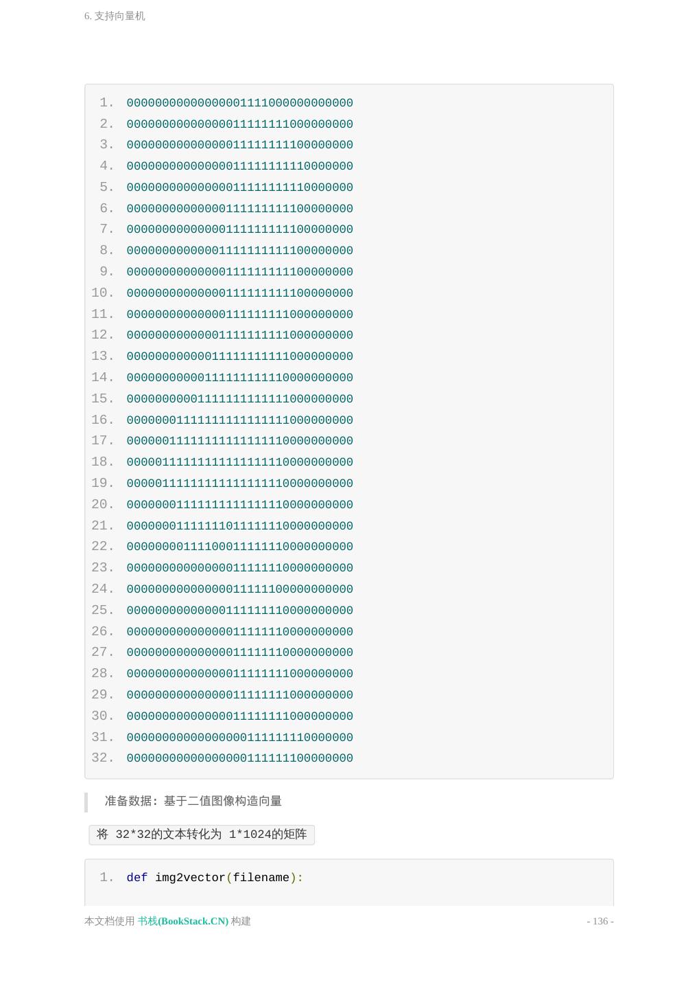5 .阅前必读 视频一套,谢谢 第一部分 分类 1.) 机器学习基础 机器学习实战-复习版(问题汇总) 2.) k-近邻算法 3.) 决策树 4.) 基于概率论的分类方法:朴素贝叶斯 5.) Logistic回归 6.) 支持向量机 7.) 集成方法-随机森林和AdaBoost 第二部分 利用回归预测数值型数据 8.) 预测数值型数据:回归 9.) 树回归 第三部分 无监督学习 10.) 使用K-均值聚类算法对未标注数据分组:k-means聚类 11.) 使用Apriori算法进行关联分析 12.) 使用FP-growth算法来高效发现频繁项集 第四部分 其他工具 13.) 利用PCA来简化数据 14.) 利用SVD简化数据 15.) 大数据与MapReduce 本文档使用 书栈(BookStack.CN) 构建 - 5 -