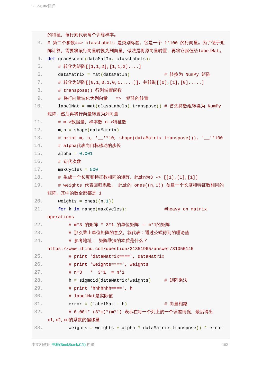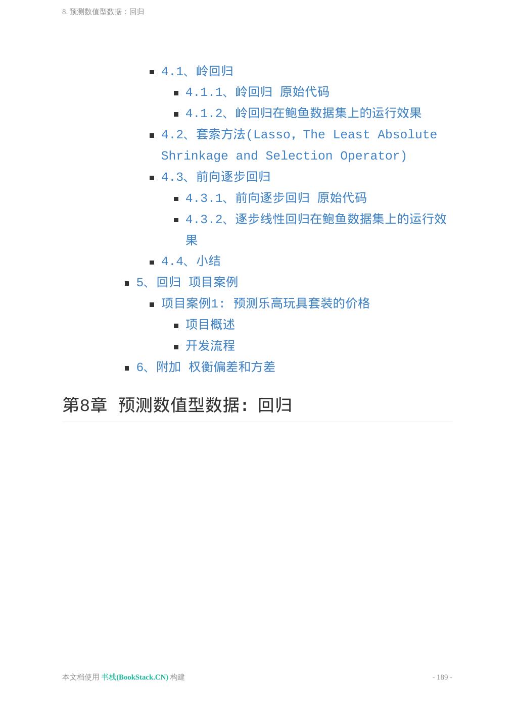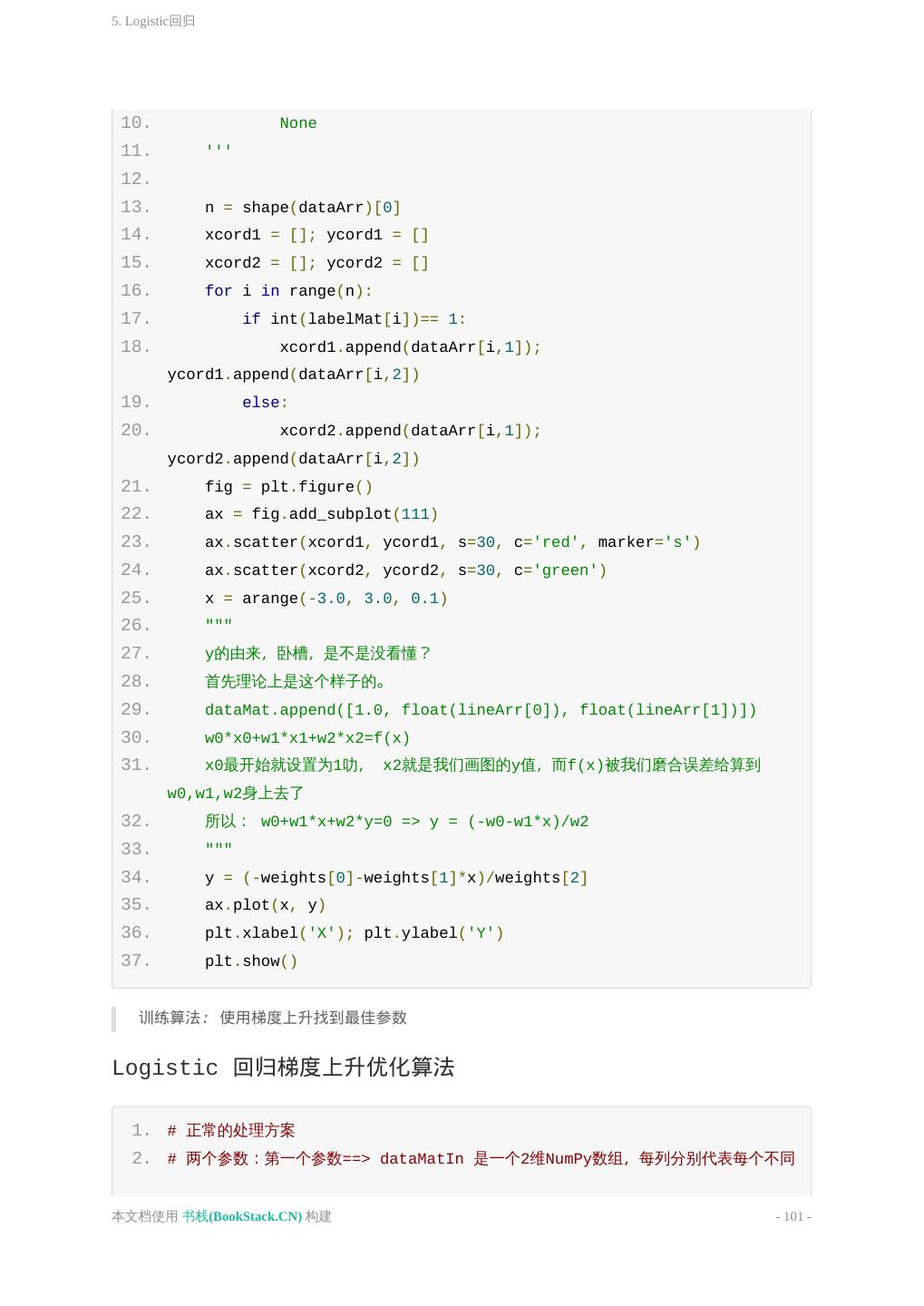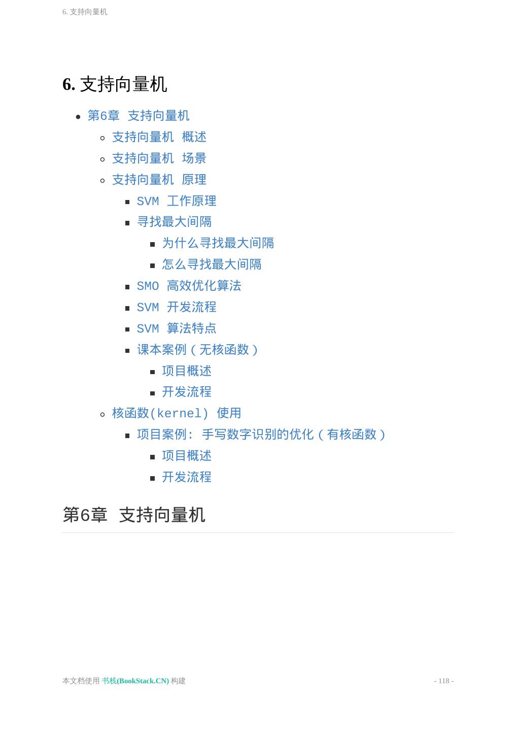 5 .阅前必读 视频一套,谢谢 第一部分 分类 1.) 机器学习基础 机器学习实战-复习版(问题汇总) 2.) k-近邻算法 3.) 决策树 4.) 基于概率论的分类方法:朴素贝叶斯 5.) Logistic回归 6.) 支持向量机 7.) 集成方法-随机森林和AdaBoost 第二部分 利用回归预测数值型数据 8.) 预测数值型数据:回归 9.) 树回归 第三部分 无监督学习 10.) 使用K-均值聚类算法对未标注数据分组:k-means聚类 11.) 使用Apriori算法进行关联分析 12.) 使用FP-growth算法来高效发现频繁项集 第四部分 其他工具 13.) 利用PCA来简化数据 14.) 利用SVD简化数据 15.) 大数据与MapReduce 本文档使用 书栈(BookStack.CN) 构建 - 5 -