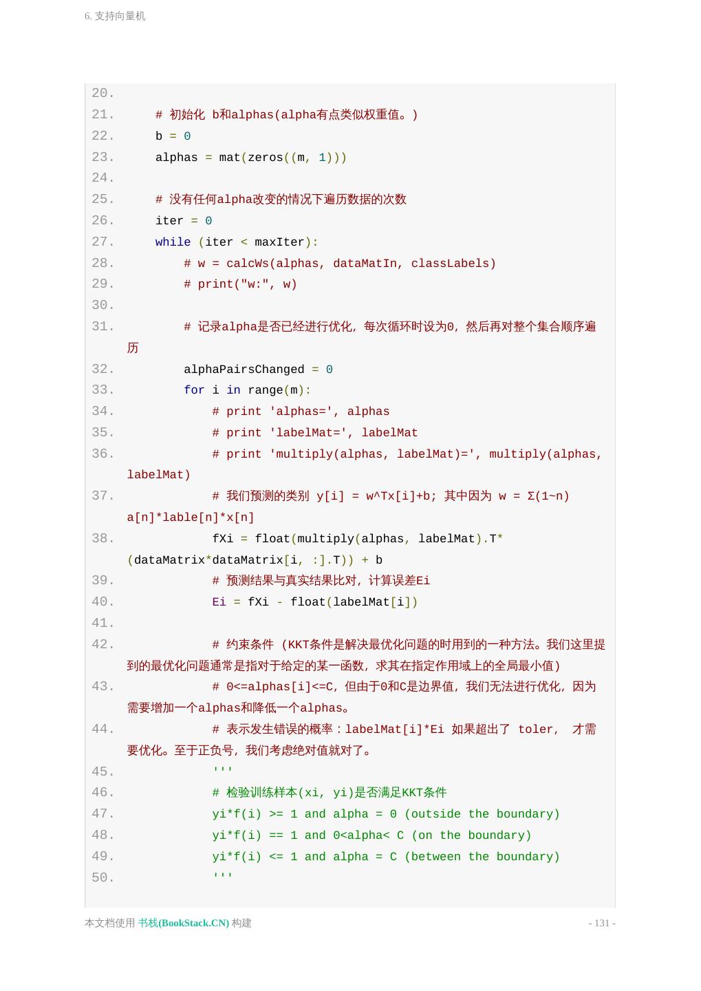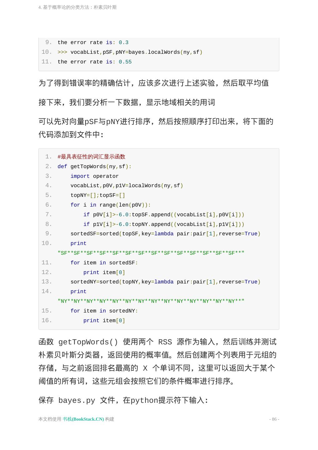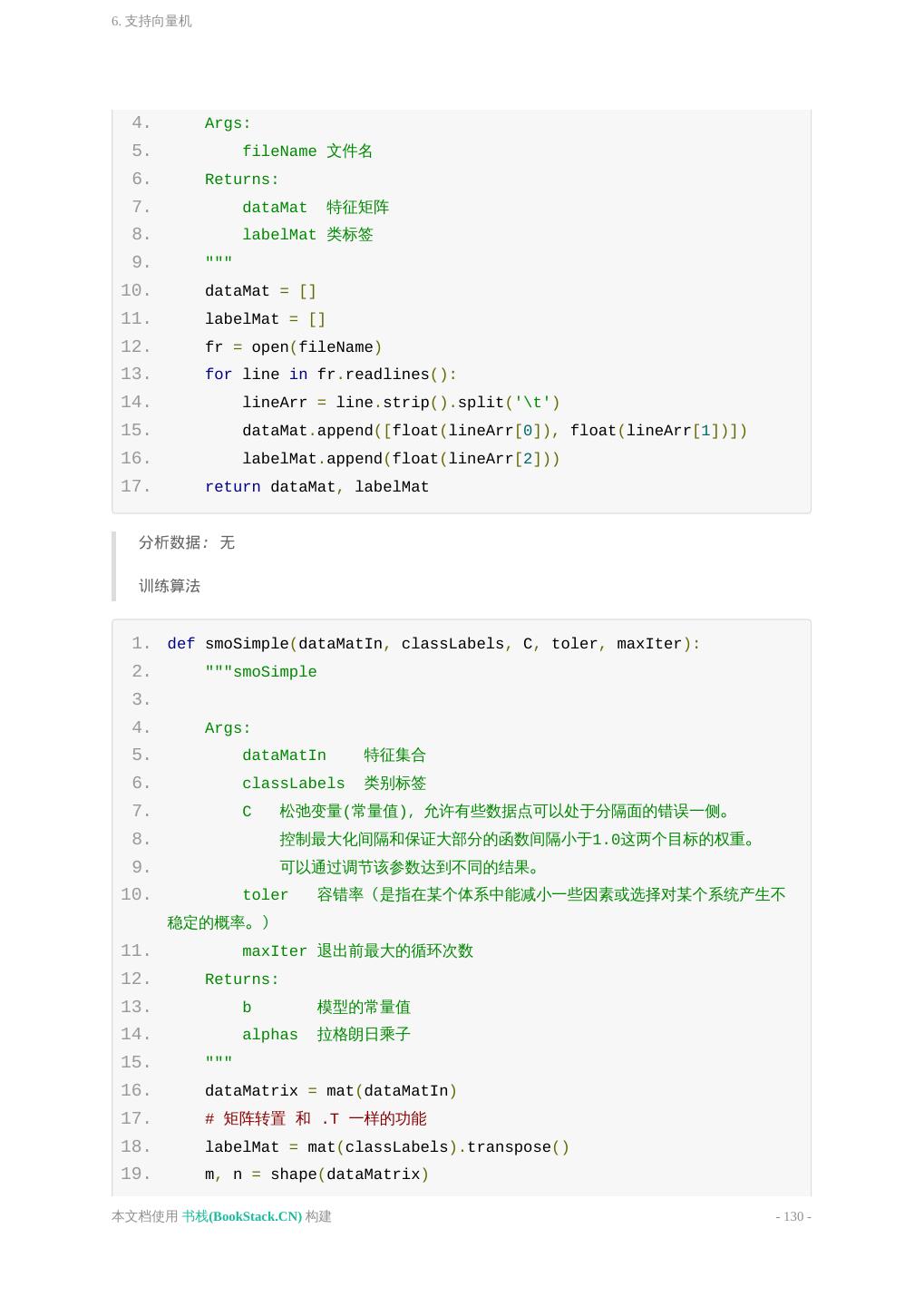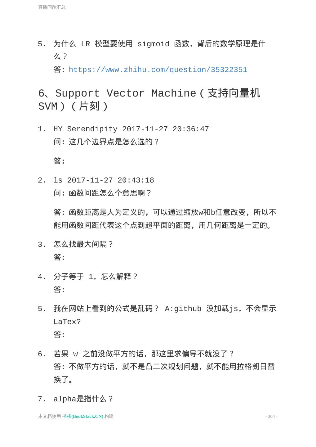 5 .阅前必读 视频一套,谢谢 第一部分 分类 1.) 机器学习基础 机器学习实战-复习版(问题汇总) 2.) k-近邻算法 3.) 决策树 4.) 基于概率论的分类方法:朴素贝叶斯 5.) Logistic回归 6.) 支持向量机 7.) 集成方法-随机森林和AdaBoost 第二部分 利用回归预测数值型数据 8.) 预测数值型数据:回归 9.) 树回归 第三部分 无监督学习 10.) 使用K-均值聚类算法对未标注数据分组:k-means聚类 11.) 使用Apriori算法进行关联分析 12.) 使用FP-growth算法来高效发现频繁项集 第四部分 其他工具 13.) 利用PCA来简化数据 14.) 利用SVD简化数据 15.) 大数据与MapReduce 本文档使用 书栈(BookStack.CN) 构建 - 5 -