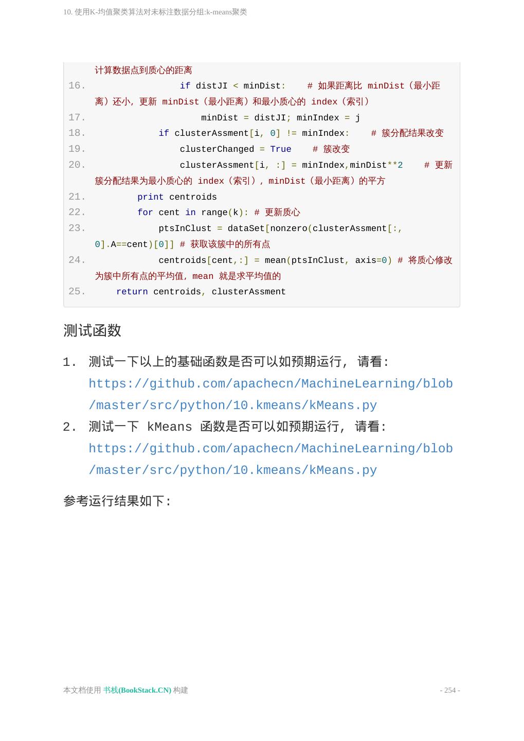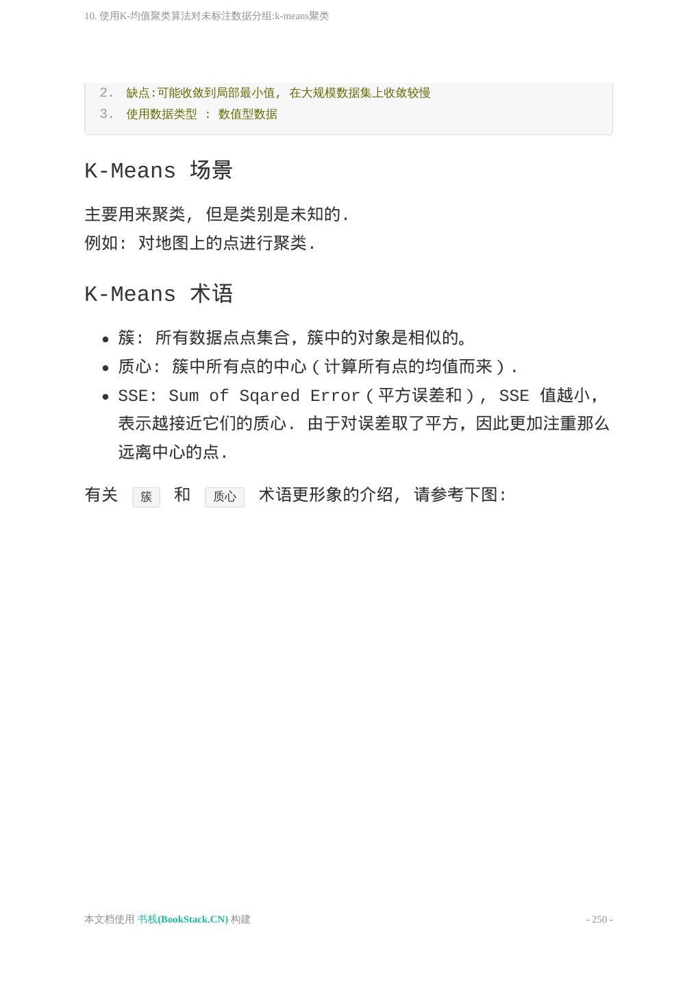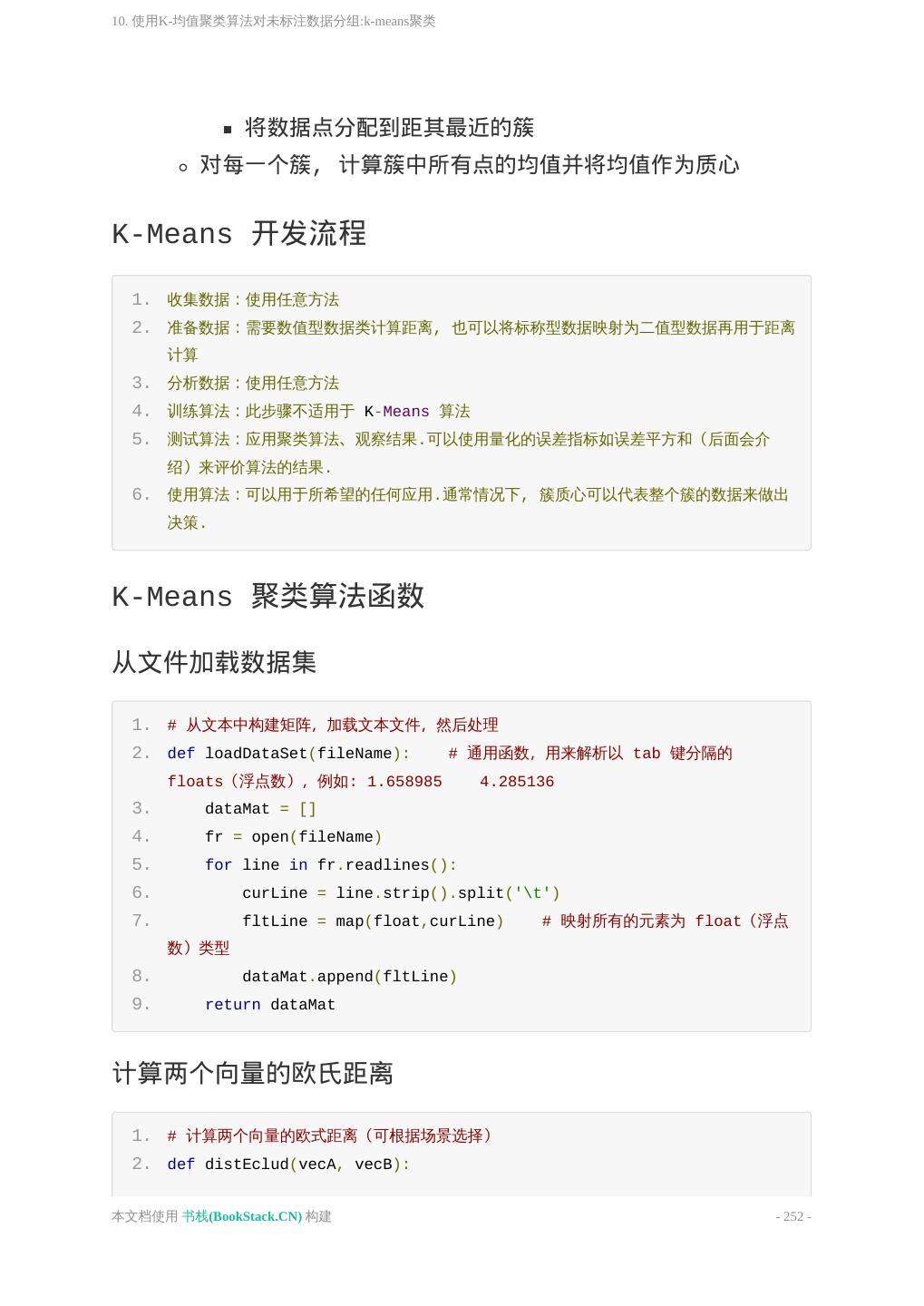 19 .1. 机器学习基础 机器学习 使用 选择算法需要考虑的两个问题 1. 算法场景 预测明天是否下雨,因为可以用历史的天气情况做预测,所以 选择监督学习算法 给一群陌生的人进行分组,但是我们并没有这些人的类别信 息,所以选择无监督学习算法、通过他们身高、体重等特征进 行处理。 2. 需要收集或分析的数据是什么 举例 机器学习 开发流程 1. 收集数据: 收集样本数据 2. 准备数据: 注意数据的格式 3. 分析数据: 为了确保数据集中没有垃圾数据; 如果是算法可以处理的数据格式或可信任的数据源,则可以跳 过该步骤; 本文档使用 书栈(BookStack.CN) 构建 - 19 -
