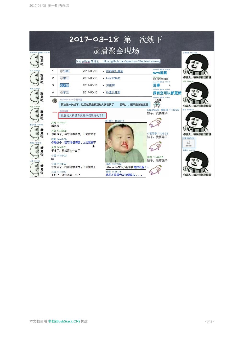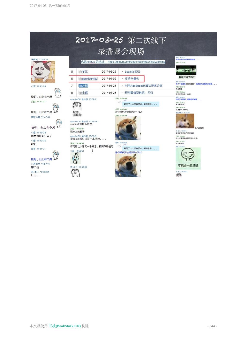 27 .机器学习实战-复习版(问题汇总) 5.直播方式 QQ:在讨论组共享屏幕(实时) 视频会在 讨论组中进行分享 B站的直播地址(延迟) 直播地址: http://live.bilibili.com/5427054 6.机器学习QQ群 ApacheCN - 学习机器学习群【629470233】 装逼不装逼,我们还是老地方见! | ApacheCN 本文档使用 书栈(BookStack.CN) 构建 - 27 -