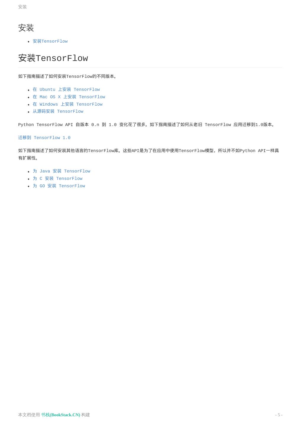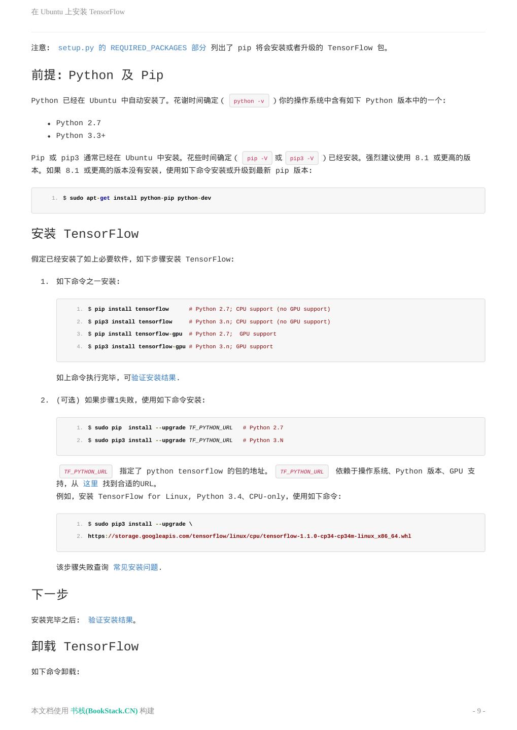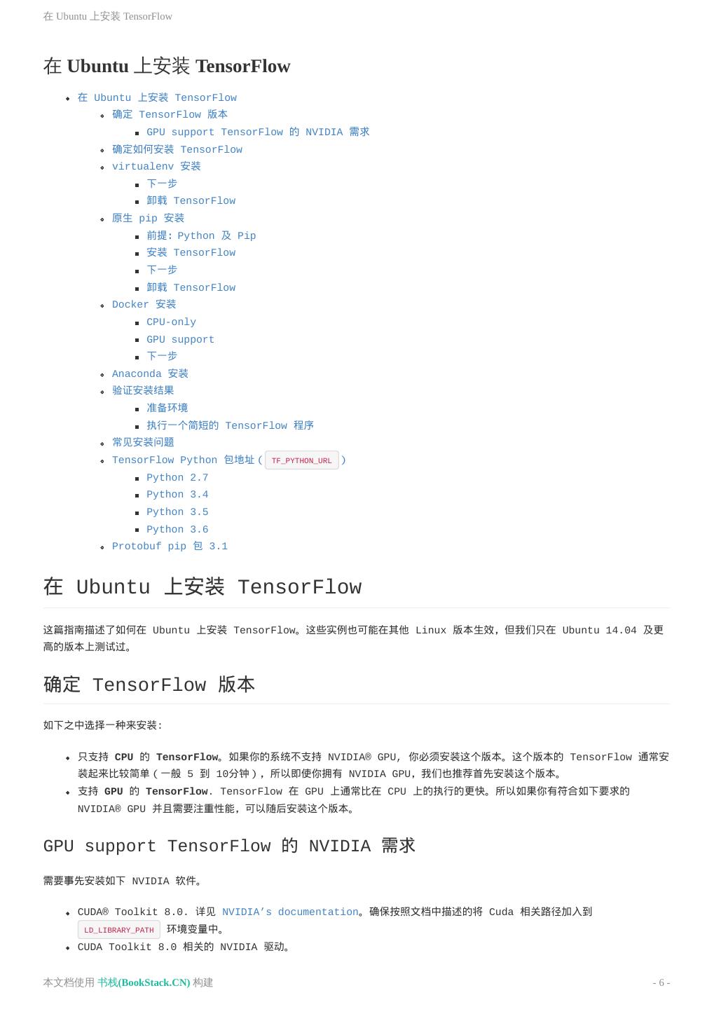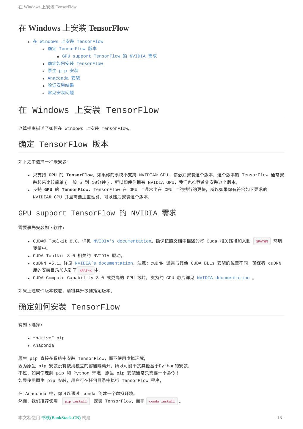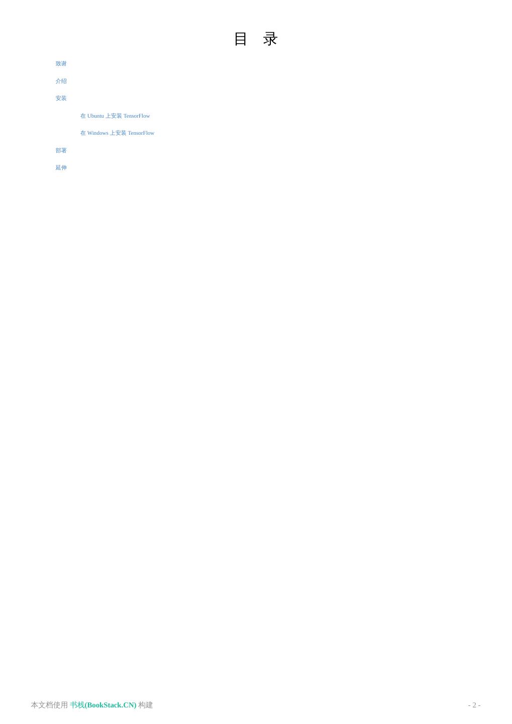 2 . 目 录 致谢 介绍 安装 在 Ubuntu 上安装 TensorFlow 在 Windows 上安装 TensorFlow 部署 延伸 本文档使用 书栈(BookStack.CN) 构建 - 2 -
