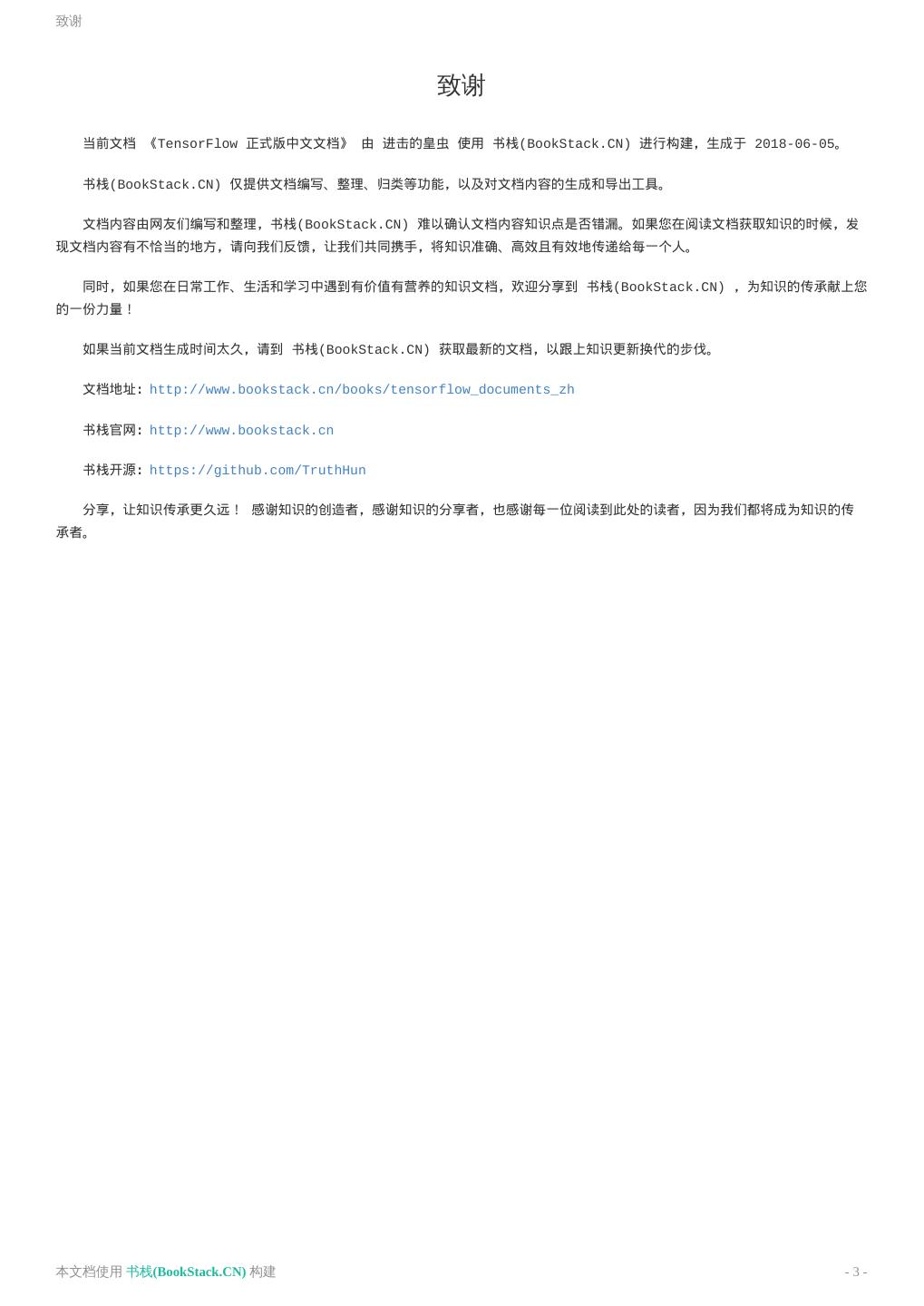 3 .致谢 致谢 当前文档 《TensorFlow 正式版中文文档》 由 进击的皇虫 使用 书栈(BookStack.CN) 进行构建,生成于 2018-06-05。 书栈(BookStack.CN) 仅提供文档编写、整理、归类等功能,以及对文档内容的生成和导出工具。 文档内容由网友们编写和整理,书栈(BookStack.CN) 难以确认文档内容知识点是否错漏。如果您在阅读文档获取知识的时候,发 现文档内容有不恰当的地方,请向我们反馈,让我们共同携手,将知识准确、高效且有效地传递给每一个人。 同时,如果您在日常工作、生活和学习中遇到有价值有营养的知识文档,欢迎分享到 书栈(BookStack.CN) ,为知识的传承献上您 的一份力量! 如果当前文档生成时间太久,请到 书栈(BookStack.CN) 获取最新的文档,以跟上知识更新换代的步伐。 文档地址:http://www.bookstack.cn/books/tensorflow_documents_zh 书栈官网:http://www.bookstack.cn 书栈开源:https://github.com/TruthHun 分享,让知识传承更久远! 感谢知识的创造者,感谢知识的分享者,也感谢每一位阅读到此处的读者,因为我们都将成为知识的传 承者。 本文档使用 书栈(BookStack.CN) 构建 - 3 -