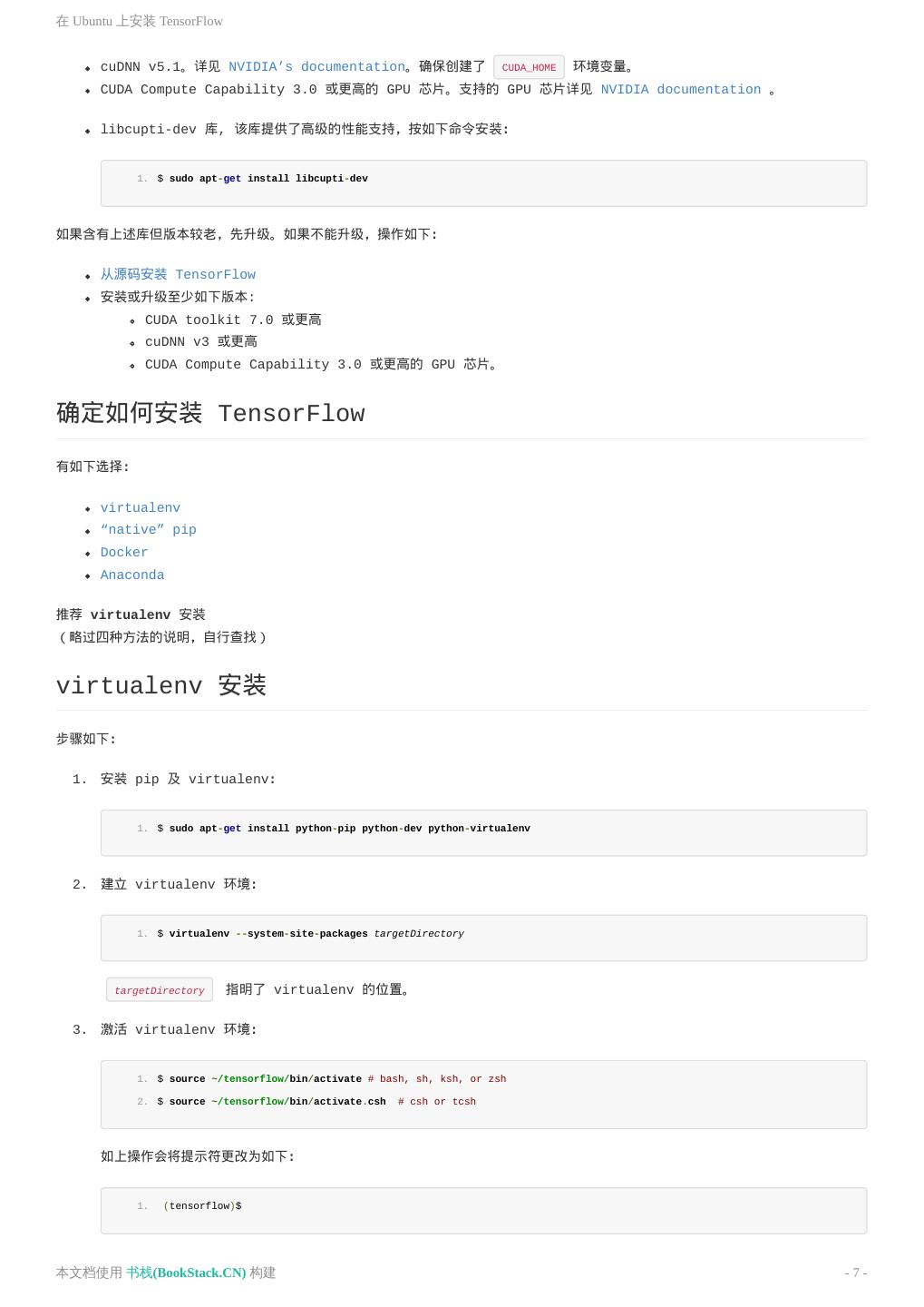 7 .在 Ubuntu 上安装 TensorFlow cuDNN v5.1。详见 NVIDIA’s documentation。确保创建了 CUDA_HOME 环境变量。 CUDA Compute Capability 3.0 或更高的 GPU 芯片。支持的 GPU 芯片详见 NVIDIA documentation 。 libcupti-dev 库, 该库提供了高级的性能支持,按如下命令安装: 1. $ sudo apt-get install libcupti-dev 如果含有上述库但版本较老,先升级。如果不能升级,操作如下: 从源码安装 TensorFlow 安装或升级至少如下版本: CUDA toolkit 7.0 或更高 cuDNN v3 或更高 CUDA Compute Capability 3.0 或更高的 GPU 芯片。 确定如何安装 TensorFlow 有如下选择: virtualenv “native” pip Docker Anaconda 推荐 virtualenv 安装 (略过四种方法的说明,自行查找) virtualenv 安装 步骤如下: 1. 安装 pip 及 virtualenv: 1. $ sudo apt-get install python-pip python-dev python-virtualenv 2. 建立 virtualenv 环境: 1. $ virtualenv --system-site-packages targetDirectory targetDirectory 指明了 virtualenv 的位置。 3. 激活 virtualenv 环境: 1. $ source ~/tensorflow/bin/activate # bash, sh, ksh, or zsh 2. $ source ~/tensorflow/bin/activate.csh # csh or tcsh 如上操作会将提示符更改为如下: 1. (tensorflow)$ 本文档使用 书栈(BookStack.CN) 构建 - 7 -