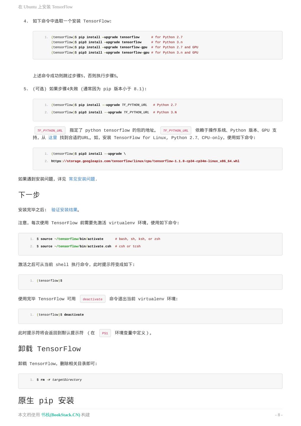 8 .在 Ubuntu 上安装 TensorFlow 4. 如下命令中选取一个安装 TensorFlow: 1. (tensorflow)$ pip install —upgrade tensorflow # for Python 2.7 (tensorflow)$ pip3 install —upgrade tensorflow # for Python 3.n (tensorflow)$ pip install —upgrade tensorflow-gpu # for Python 2.7 and GPU (tensorflow)$ pip3 install —upgrade tensorflow-gpu # for Python 3.n and GPU 上述命令成功则跳过步骤5,否则执行步骤5。 5. (可选) 如果步骤4失败 (通常因为 pip 版本小于 8.1): 1. (tensorflow)$ pip install --upgrade TF_PYTHON_URL # Python 2.7 2. (tensorflow)$ pip3 install --upgrade TF_PYTHON_URL # Python 3.N TF_PYTHON_URL 指定了 python tensorflow 的包的地址。 TF_PYTHON_URL 依赖于操作系统、Python 版本、GPU 支 持,从 这里 找到合适的URL。如,安装 TensorFlow for Linux, Python 2.7、CPU-only,使用如下命令: 1. (tensorflow)$ pip3 install --upgrade \ 2. https://storage.googleapis.com/tensorflow/linux/cpu/tensorflow-1.1.0-cp34-cp34m-linux_x86_64.whl 如果遇到安装问题,详见 常见安装问题. 下一步 安装完毕之后: 验证安装结果。 注意,每次使用 TensorFlow 前需要先激活 virtualenv 环境,使用如下命令: 1. $ source ~/tensorflow/bin/activate # bash, sh, ksh, or zsh 2. $ source ~/tensorflow/bin/activate.csh # csh or tcsh 激活之后可从当前 shell 执行命令,此时提示符变成如下: 1. (tensorflow)$ 使用完毕 TensorFlow 可用 deactivate 命令退出当前 virtualenv 环境: 1. (tensorflow)$ deactivate 此时提示符将会返回到默认提示符 (在 PS1 环境变量中定义)。 卸载 TensorFlow 卸载 TensorFlow,删除相关目录即可: 1. $ rm -r targetDirectory 原生 pip 安装 本文档使用 书栈(BookStack.CN) 构建 - 8 -