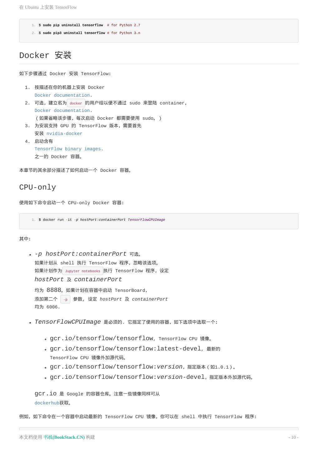 10 .在 Ubuntu 上安装 TensorFlow 1. $ sudo pip uninstall tensorflow # for Python 2.7 2. $ sudo pip3 uninstall tensorflow # for Python 3.n Docker 安装 如下步骤通过 Docker 安装 TensorFlow: 1. 按描述在你的机器上安装 Docker Docker documentation. 2. 可选,建立名为 docker 的用户组以便不通过 sudo 来登陆 container, Docker documentation. (如果省略该步骤,每次启动 Docker 都需要使用 sudo。) 3. 为安装支持 GPU 的 TensorFlow 版本,需要首先 安装 nvidia-docker 4. 启动含有 TensorFlow binary images. 之一的 Docker 容器。 本章节的其余部分描述了如何启动一个 Docker 容器。 CPU-only 使用如下命令启动一个 CPU-only Docker 容器: 1. $ docker run -it -p hostPort:containerPort TensorFlowCPUImage 其中: -p hostPort:containerPort 可选。 如果计划从 shell 执行 TensorFlow 程序,忽略该选项。 如果计划作为 Jupyter notebooks 执行 TensorFlow 程序,设定 hostPort 及 containerPort 均为 8888。如果计划在容器中启动 TensorBoard, 添加第二个 -p 参数, 设定 hostPort 及 containerPort 均为 6006. TensorFlowCPUImage 是必须的. 它指定了使用的容器,如下选项中选取一个: gcr.io/tensorflow/tensorflow, TensorFlow CPU 镜像。 gcr.io/tensorflow/tensorflow:latest-devel, 最新的 TensorFlow CPU 镜像外加源代码。 gcr.io/tensorflow/tensorflow:version,指定版本(如1.0.1)。 gcr.io/tensorflow/tensorflow:version-devel,指定版本外加源代码。 gcr.io 是 Google 的容器仓库。注意一些镜像同样可从 dockerhub获取。 例如,如下命令在一个容器中启动最新的 TensorFlow CPU 镜像,你可以在 shell 中执行 TensorFlow 程序: 本文档使用 书栈(BookStack.CN) 构建 - 10 -