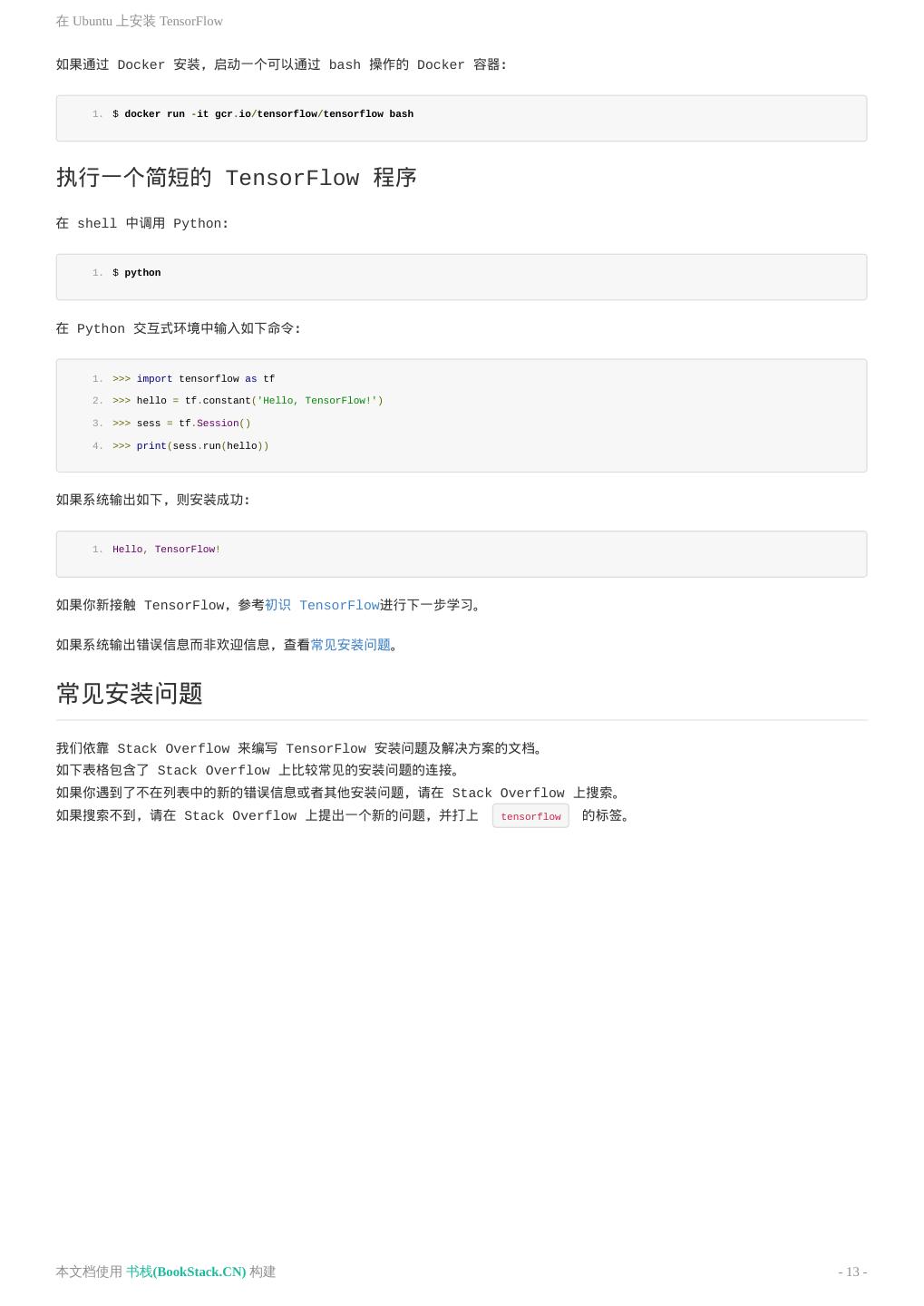 13 .在 Ubuntu 上安装 TensorFlow 如果通过 Docker 安装,启动一个可以通过 bash 操作的 Docker 容器: 1. $ docker run -it gcr.io/tensorflow/tensorflow bash 执行一个简短的 TensorFlow 程序 在 shell 中调用 Python: 1. $ python 在 Python 交互式环境中输入如下命令: 1. >>> import tensorflow as tf 2. >>> hello = tf.constant('Hello, TensorFlow!') 3. >>> sess = tf.Session() 4. >>> print(sess.run(hello)) 如果系统输出如下,则安装成功: 1. Hello, TensorFlow! 如果你新接触 TensorFlow,参考初识 TensorFlow进行下一步学习。 如果系统输出错误信息而非欢迎信息,查看常见安装问题。 常见安装问题 我们依靠 Stack Overflow 来编写 TensorFlow 安装问题及解决方案的文档。 如下表格包含了 Stack Overflow 上比较常见的安装问题的连接。 如果你遇到了不在列表中的新的错误信息或者其他安装问题,请在 Stack Overflow 上搜索。 如果搜索不到,请在 Stack Overflow 上提出一个新的问题,并打上 tensorflow 的标签。 本文档使用 书栈(BookStack.CN) 构建 - 13 -