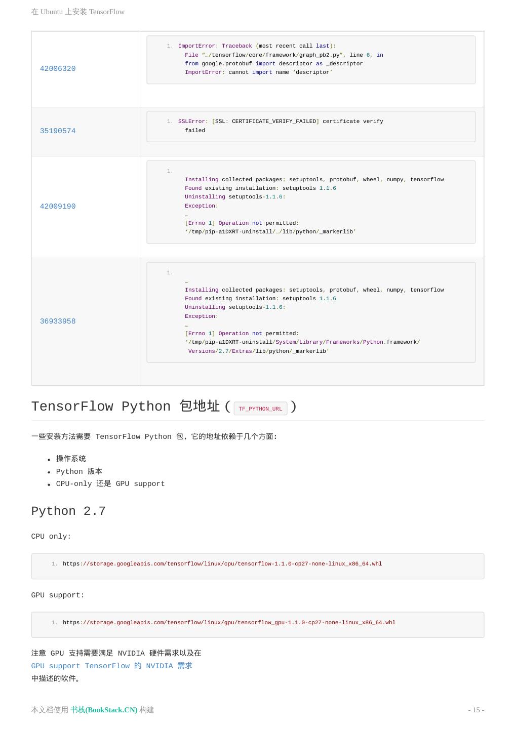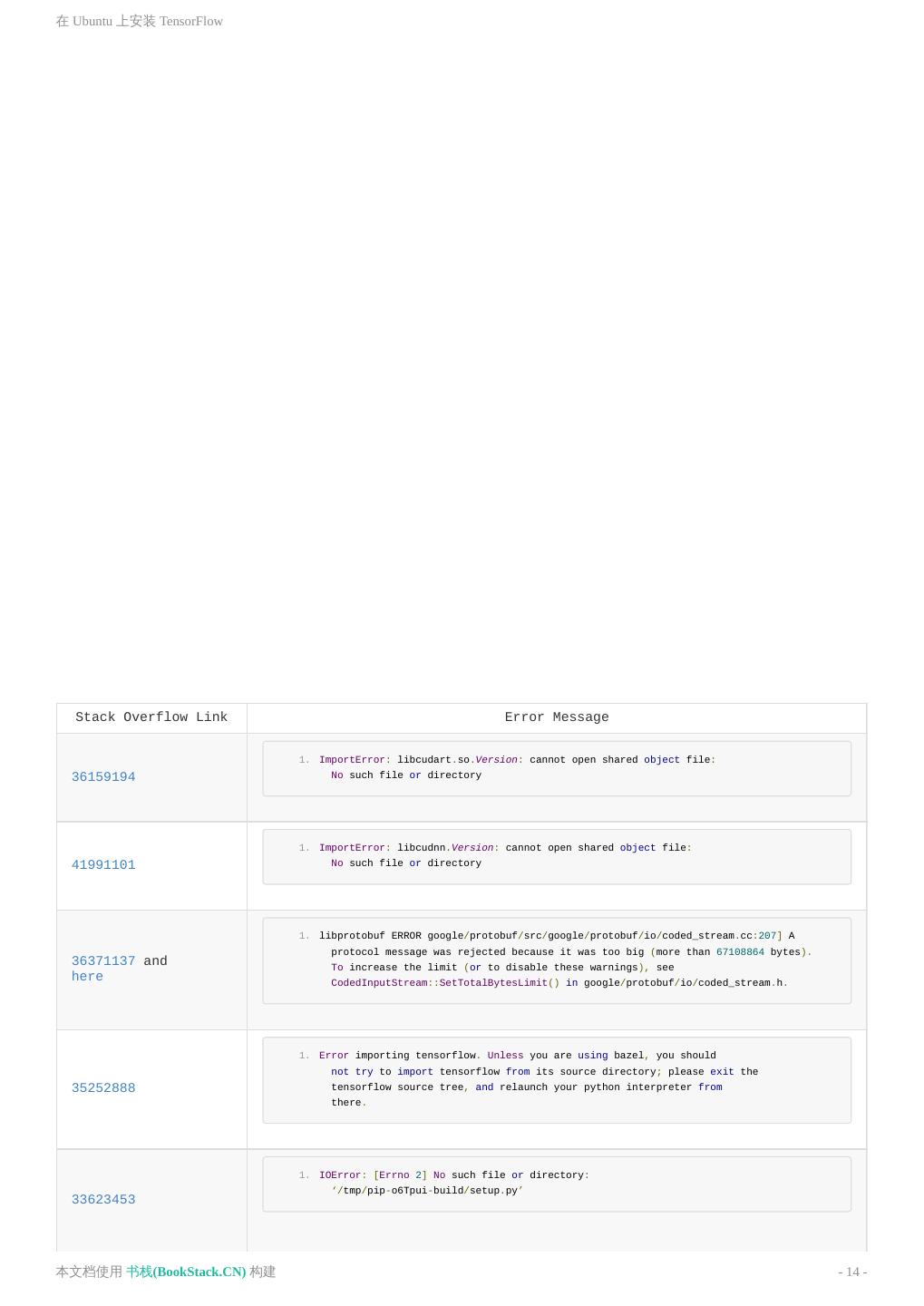 14 .在 Ubuntu 上安装 TensorFlow Stack Overflow Link Error Message 1. ImportError: libcudart.so.Version: cannot open shared object file: 36159194 No such file or directory 1. ImportError: libcudnn.Version: cannot open shared object file: 41991101 No such file or directory 1. libprotobuf ERROR google/protobuf/src/google/protobuf/io/coded_stream.cc:207] A protocol message was rejected because it was too big (more than 67108864 bytes). 36371137 and To increase the limit (or to disable these warnings), see here CodedInputStream::SetTotalBytesLimit() in google/protobuf/io/coded_stream.h. 1. Error importing tensorflow. Unless you are using bazel, you should not try to import tensorflow from its source directory; please exit the 35252888 tensorflow source tree, and relaunch your python interpreter from there. 1. IOError: [Errno 2] No such file or directory: ‘/tmp/pip-o6Tpui-build/setup.py’ 33623453 本文档使用 书栈(BookStack.CN) 构建 - 14 -