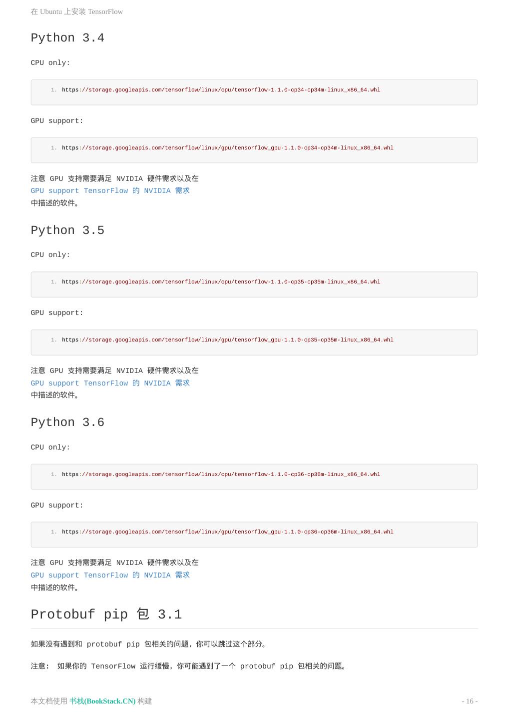 16 .在 Ubuntu 上安装 TensorFlow Python 3.4 CPU only: 1. https://storage.googleapis.com/tensorflow/linux/cpu/tensorflow-1.1.0-cp34-cp34m-linux_x86_64.whl GPU support: 1. https://storage.googleapis.com/tensorflow/linux/gpu/tensorflow_gpu-1.1.0-cp34-cp34m-linux_x86_64.whl 注意 GPU 支持需要满足 NVIDIA 硬件需求以及在 GPU support TensorFlow 的 NVIDIA 需求 中描述的软件。 Python 3.5 CPU only: 1. https://storage.googleapis.com/tensorflow/linux/cpu/tensorflow-1.1.0-cp35-cp35m-linux_x86_64.whl GPU support: 1. https://storage.googleapis.com/tensorflow/linux/gpu/tensorflow_gpu-1.1.0-cp35-cp35m-linux_x86_64.whl 注意 GPU 支持需要满足 NVIDIA 硬件需求以及在 GPU support TensorFlow 的 NVIDIA 需求 中描述的软件。 Python 3.6 CPU only: 1. https://storage.googleapis.com/tensorflow/linux/cpu/tensorflow-1.1.0-cp36-cp36m-linux_x86_64.whl GPU support: 1. https://storage.googleapis.com/tensorflow/linux/gpu/tensorflow_gpu-1.1.0-cp36-cp36m-linux_x86_64.whl 注意 GPU 支持需要满足 NVIDIA 硬件需求以及在 GPU support TensorFlow 的 NVIDIA 需求 中描述的软件。 Protobuf pip 包 3.1 如果没有遇到和 protobuf pip 包相关的问题,你可以跳过这个部分。 注意: 如果你的 TensorFlow 运行缓慢,你可能遇到了一个 protobuf pip 包相关的问题。 本文档使用 书栈(BookStack.CN) 构建 - 16 -