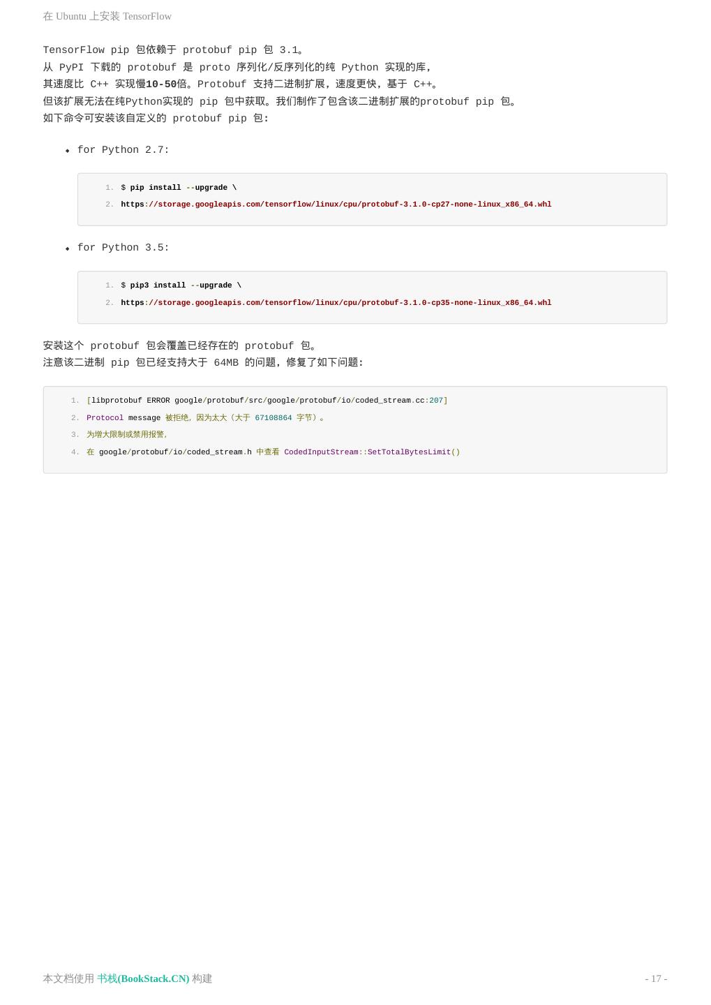 17 .在 Ubuntu 上安装 TensorFlow TensorFlow pip 包依赖于 protobuf pip 包 3.1。 从 PyPI 下载的 protobuf 是 proto 序列化/反序列化的纯 Python 实现的库, 其速度比 C++ 实现慢10-50倍。Protobuf 支持二进制扩展,速度更快,基于 C++。 但该扩展无法在纯Python实现的 pip 包中获取。我们制作了包含该二进制扩展的protobuf pip 包。 如下命令可安装该自定义的 protobuf pip 包: for Python 2.7: 1. $ pip install --upgrade \ 2. https://storage.googleapis.com/tensorflow/linux/cpu/protobuf-3.1.0-cp27-none-linux_x86_64.whl for Python 3.5: 1. $ pip3 install --upgrade \ 2. https://storage.googleapis.com/tensorflow/linux/cpu/protobuf-3.1.0-cp35-none-linux_x86_64.whl 安装这个 protobuf 包会覆盖已经存在的 protobuf 包。 注意该二进制 pip 包已经支持大于 64MB 的问题,修复了如下问题: 1. [libprotobuf ERROR google/protobuf/src/google/protobuf/io/coded_stream.cc:207] 2. Protocol message 被拒绝,因为太大(大于 67108864 字节)。 3. 为增大限制或禁用报警, 4. 在 google/protobuf/io/coded_stream.h 中查看 CodedInputStream::SetTotalBytesLimit() 本文档使用 书栈(BookStack.CN) 构建 - 17 -