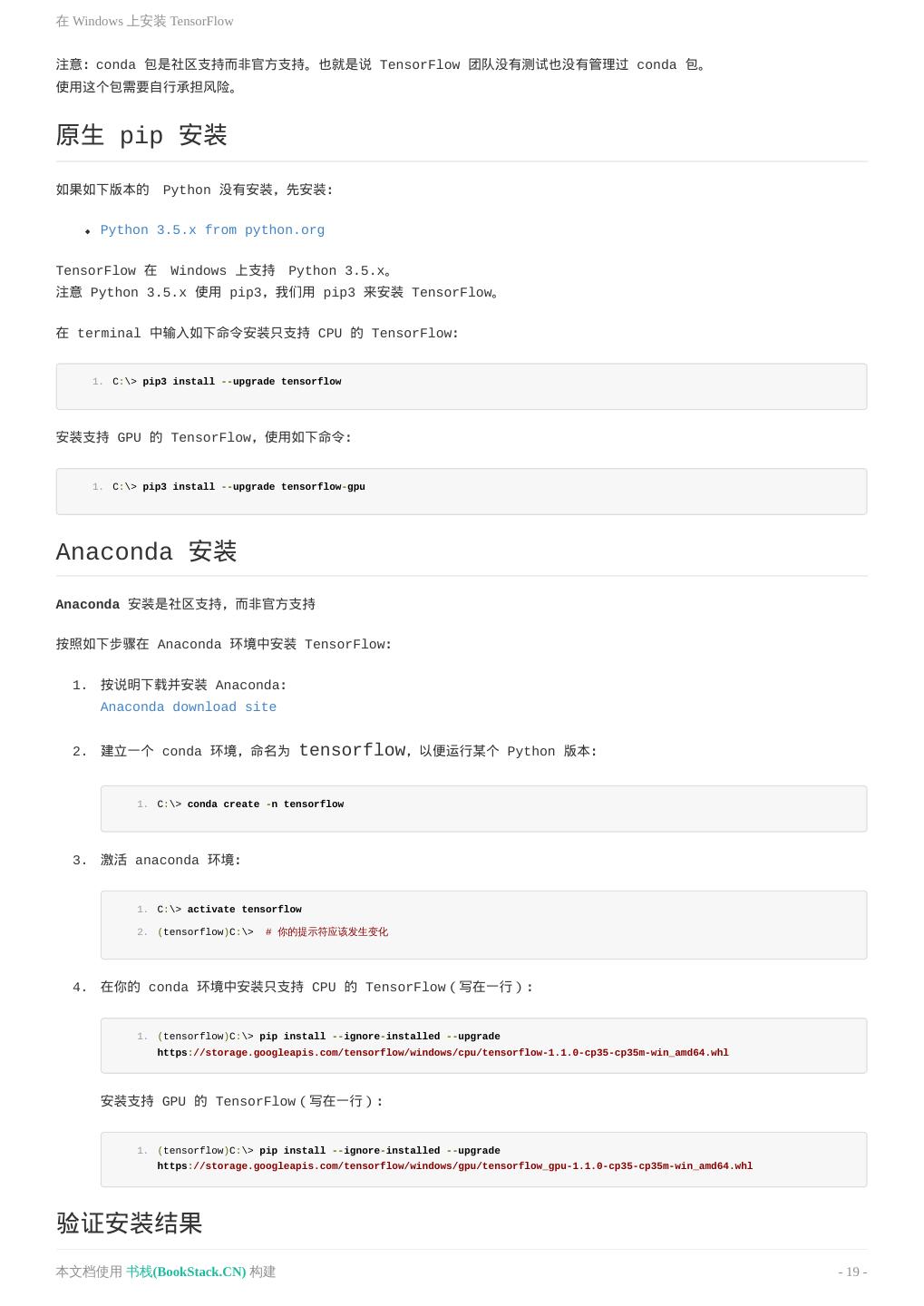 19 .在 Windows 上安装 TensorFlow 注意:conda 包是社区支持而非官方支持。也就是说 TensorFlow 团队没有测试也没有管理过 conda 包。 使用这个包需要自行承担风险。 原生 pip 安装 如果如下版本的 Python 没有安装,先安装: Python 3.5.x from python.org TensorFlow 在 Windows 上支持 Python 3.5.x。 注意 Python 3.5.x 使用 pip3,我们用 pip3 来安装 TensorFlow。 在 terminal 中输入如下命令安装只支持 CPU 的 TensorFlow: 1. C:\> pip3 install --upgrade tensorflow 安装支持 GPU 的 TensorFlow,使用如下命令: 1. C:\> pip3 install --upgrade tensorflow-gpu Anaconda 安装 Anaconda 安装是社区支持,而非官方支持 按照如下步骤在 Anaconda 环境中安装 TensorFlow: 1. 按说明下载并安装 Anaconda: Anaconda download site 2. 建立一个 conda 环境,命名为 tensorflow,以便运行某个 Python 版本: 1. C:\> conda create -n tensorflow 3. 激活 anaconda 环境: 1. C:\> activate tensorflow 2. (tensorflow)C:\> # 你的提示符应该发生变化 4. 在你的 conda 环境中安装只支持 CPU 的 TensorFlow(写在一行): 1. (tensorflow)C:\> pip install --ignore-installed --upgrade https://storage.googleapis.com/tensorflow/windows/cpu/tensorflow-1.1.0-cp35-cp35m-win_amd64.whl 安装支持 GPU 的 TensorFlow(写在一行): 1. (tensorflow)C:\> pip install --ignore-installed --upgrade https://storage.googleapis.com/tensorflow/windows/gpu/tensorflow_gpu-1.1.0-cp35-cp35m-win_amd64.whl 验证安装结果 本文档使用 书栈(BookStack.CN) 构建 - 19 -