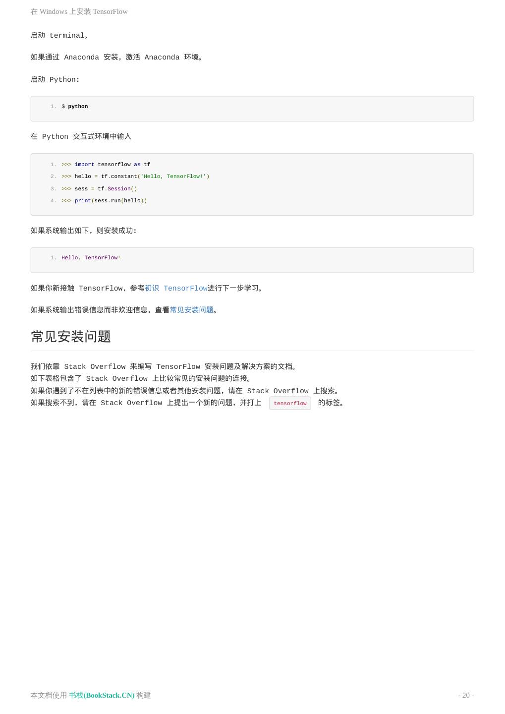 20 .在 Windows 上安装 TensorFlow 启动 terminal。 如果通过 Anaconda 安装,激活 Anaconda 环境。 启动 Python: 1. $ python 在 Python 交互式环境中输入 1. >>> import tensorflow as tf 2. >>> hello = tf.constant('Hello, TensorFlow!') 3. >>> sess = tf.Session() 4. >>> print(sess.run(hello)) 如果系统输出如下,则安装成功: 1. Hello, TensorFlow! 如果你新接触 TensorFlow,参考初识 TensorFlow进行下一步学习。 如果系统输出错误信息而非欢迎信息,查看常见安装问题。 常见安装问题 我们依靠 Stack Overflow 来编写 TensorFlow 安装问题及解决方案的文档。 如下表格包含了 Stack Overflow 上比较常见的安装问题的连接。 如果你遇到了不在列表中的新的错误信息或者其他安装问题,请在 Stack Overflow 上搜索。 如果搜索不到,请在 Stack Overflow 上提出一个新的问题,并打上 tensorflow 的标签。 本文档使用 书栈(BookStack.CN) 构建 - 20 -