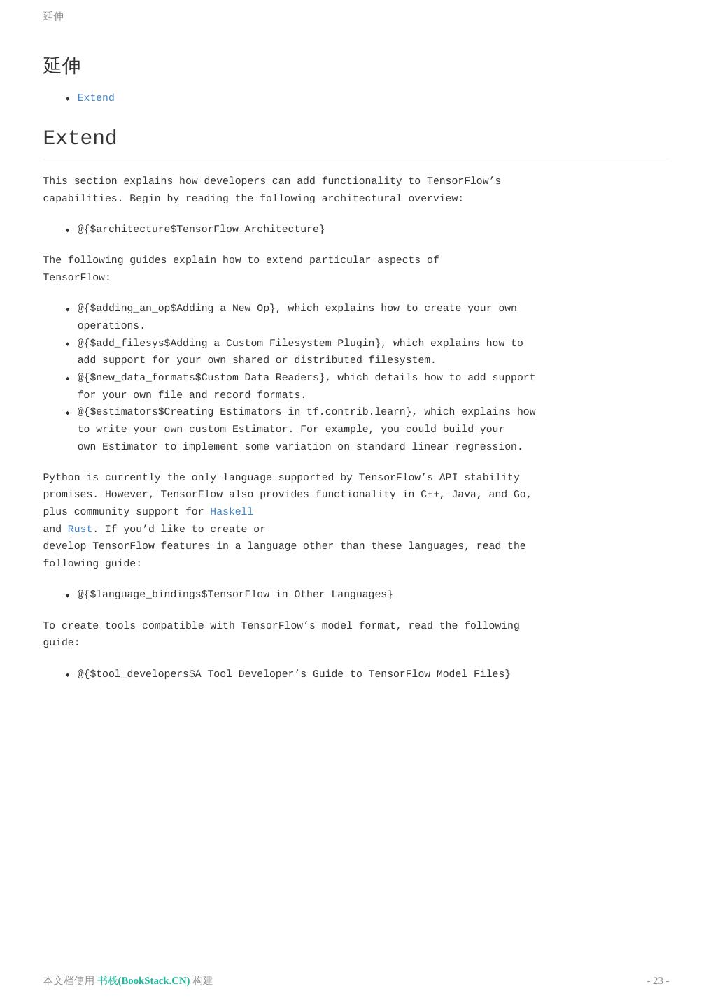 23 .延伸 延伸 Extend Extend This section explains how developers can add functionality to TensorFlow’s capabilities. Begin by reading the following architectural overview: @{$architecture$TensorFlow Architecture} The following guides explain how to extend particular aspects of TensorFlow: @{$adding_an_op$Adding a New Op}, which explains how to create your own operations. @{$add_filesys$Adding a Custom Filesystem Plugin}, which explains how to add support for your own shared or distributed filesystem. @{$new_data_formats$Custom Data Readers}, which details how to add support for your own file and record formats. @{$estimators$Creating Estimators in tf.contrib.learn}, which explains how to write your own custom Estimator. For example, you could build your own Estimator to implement some variation on standard linear regression. Python is currently the only language supported by TensorFlow’s API stability promises. However, TensorFlow also provides functionality in C++, Java, and Go, plus community support for Haskell and Rust. If you’d like to create or develop TensorFlow features in a language other than these languages, read the following guide: @{$language_bindings$TensorFlow in Other Languages} To create tools compatible with TensorFlow’s model format, read the following guide: @{$tool_developers$A Tool Developer’s Guide to TensorFlow Model Files} 本文档使用 书栈(BookStack.CN) 构建 - 23 -