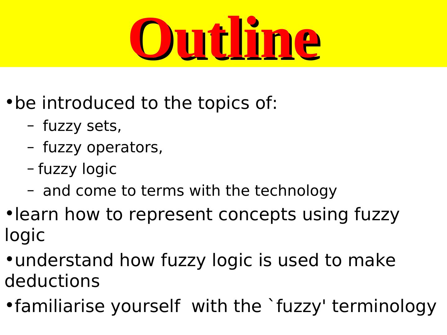 9 . Outline •be introduced to the topics of: – fuzzy sets, – fuzzy operators, – fuzzy logic – and come to terms with the technology •learn how to represent concepts using fuzzy logic •understand how fuzzy logic is used to make deductions •familiarise yourself with the `fuzzy' terminology