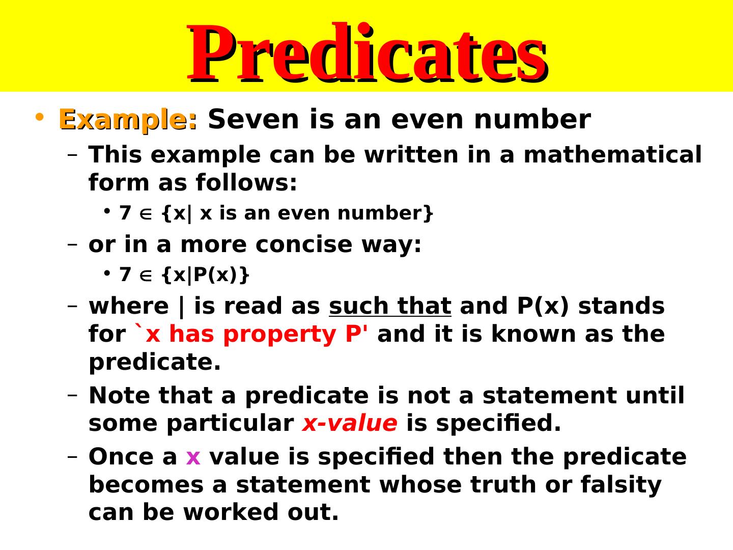 13 . Predicates • Example: Seven is an even number – This example can be written in a mathematical form as follows: • 7 {x| x is an even number}x| x is an even number} – or in a more concise way: • 7 {x| x is an even number}x|P(x)} } – where | is read as such that and P(x)} stands for `x has property P' and it is known as the predicate. – Note that a predicate is not a statement until some particular x-value is specified. – Once a x value is specified then the predicate becomes a statement whose truth or falsity can be worked out.