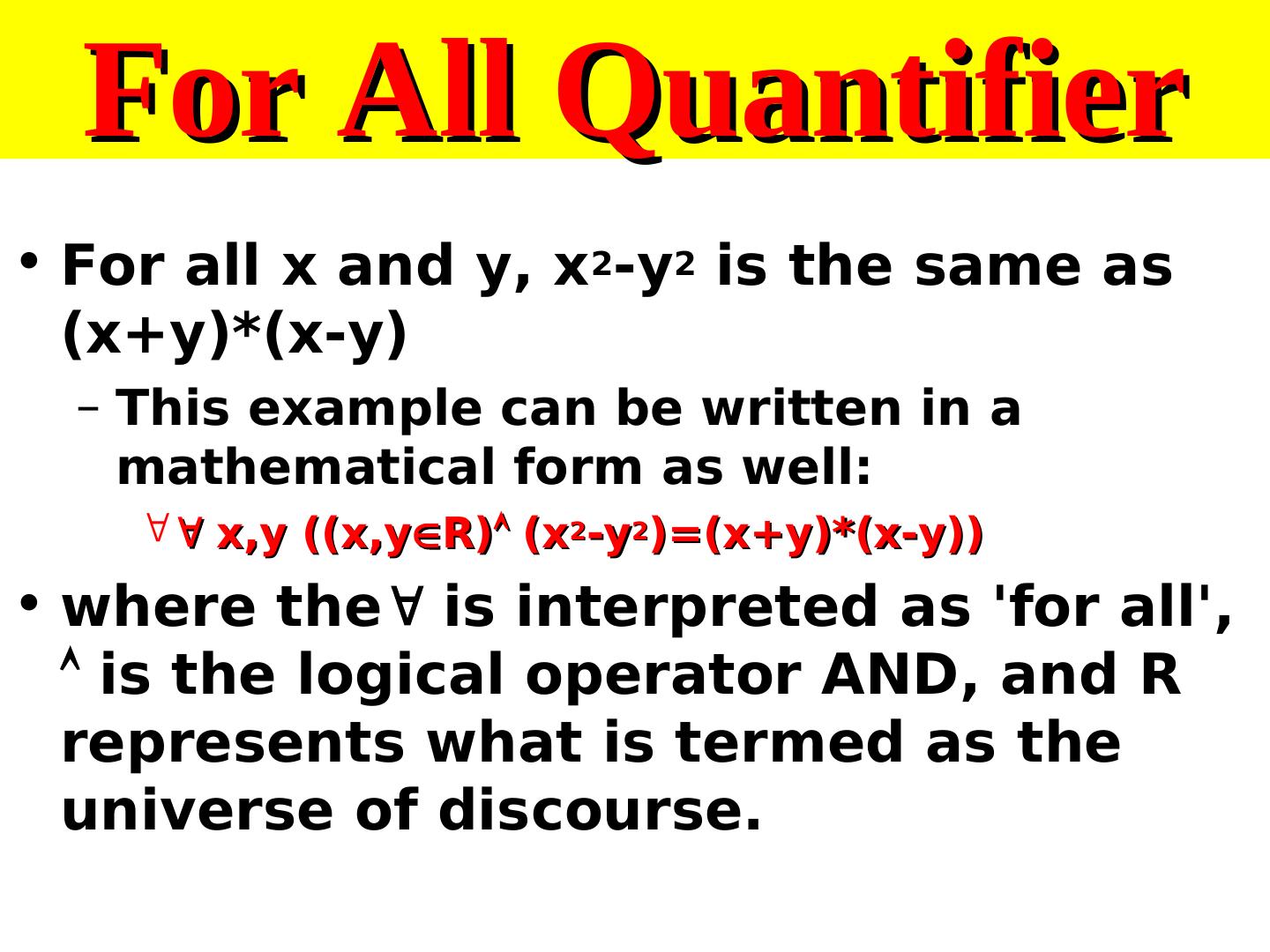 14 . For All Quantifier • For all x and y, x2-y2 is the same as (x+y)} *(x-y)} – This example can be written in a mathematical form as well: x,y ((x,yR)} (x2-y2)} =(x+y)} *(x-y)} )} • where the is interpreted as 'for all', is the logical operator AND, and R represents what is termed as the universe of discourse.