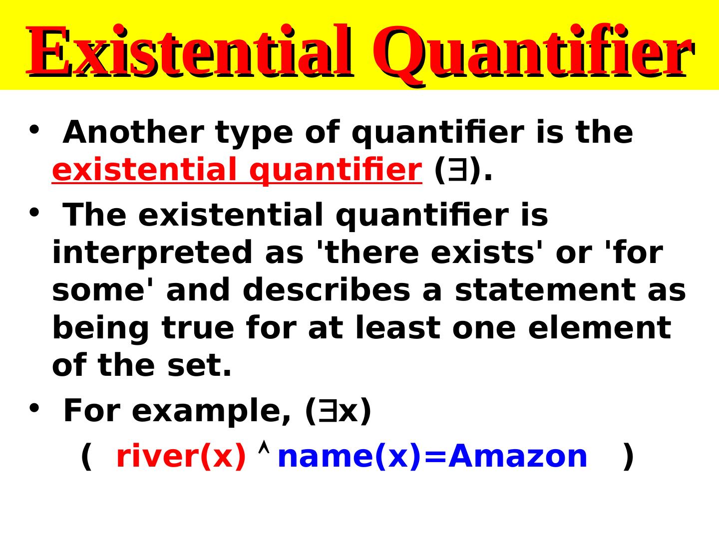 16 .Existential Quantifier • Another type of quantifier is the existential quantifier ()} . • The existential quantifier is interpreted as 'there exists' or 'for some' and describes a statement as being true for at least one element of the set. • For example, (x)} ( river(x)} name(x)} =Amazon )}