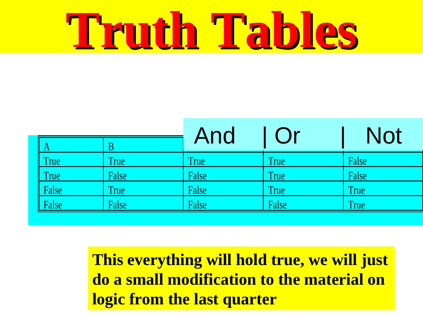 18 . Truth Tables A B And AÙB |AÚB Or | ~ A Not True True True True False True False False True False False True False True True False False False False True This everything will hold true, we will just do a small modification to the material on logic from the last quarter