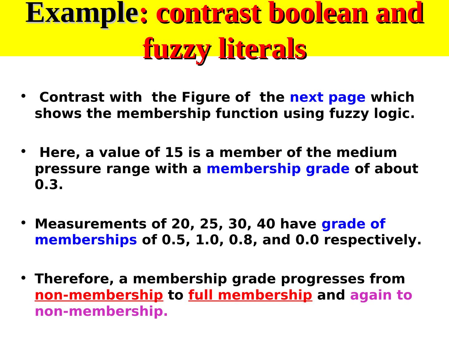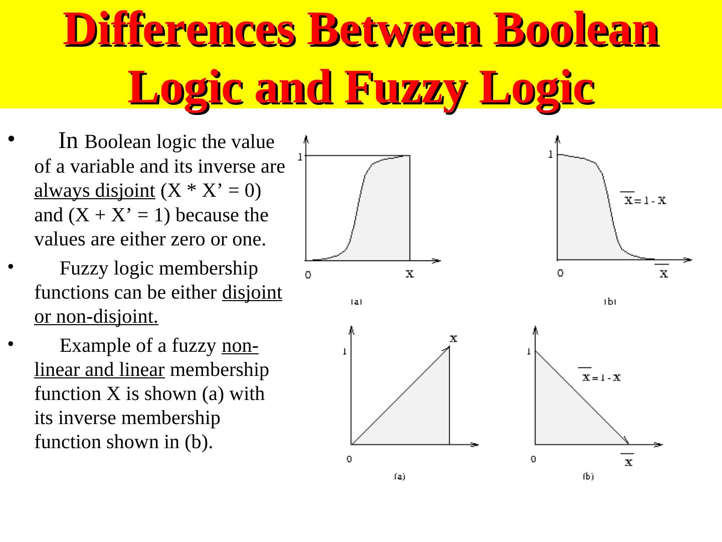 22 . Differences Between Boolean Logic and Fuzzy Logic • In Boolean logic the value of a variable and its inverse are always disjoint (X * X’ = 0) and (X + X’ = 1) because the values are either zero or one. • Fuzzy logic membership functions can be either disjoint or non-disjoint. • Example of a fuzzy non- linear and linear membership function X is shown (a) with its inverse membership function shown in (b).