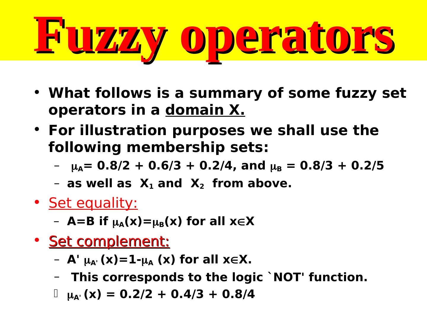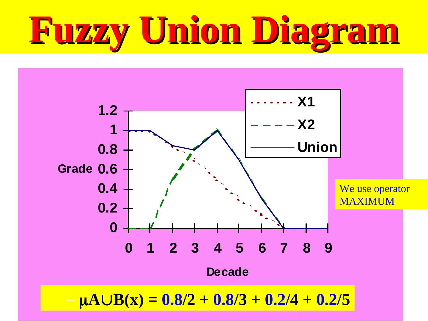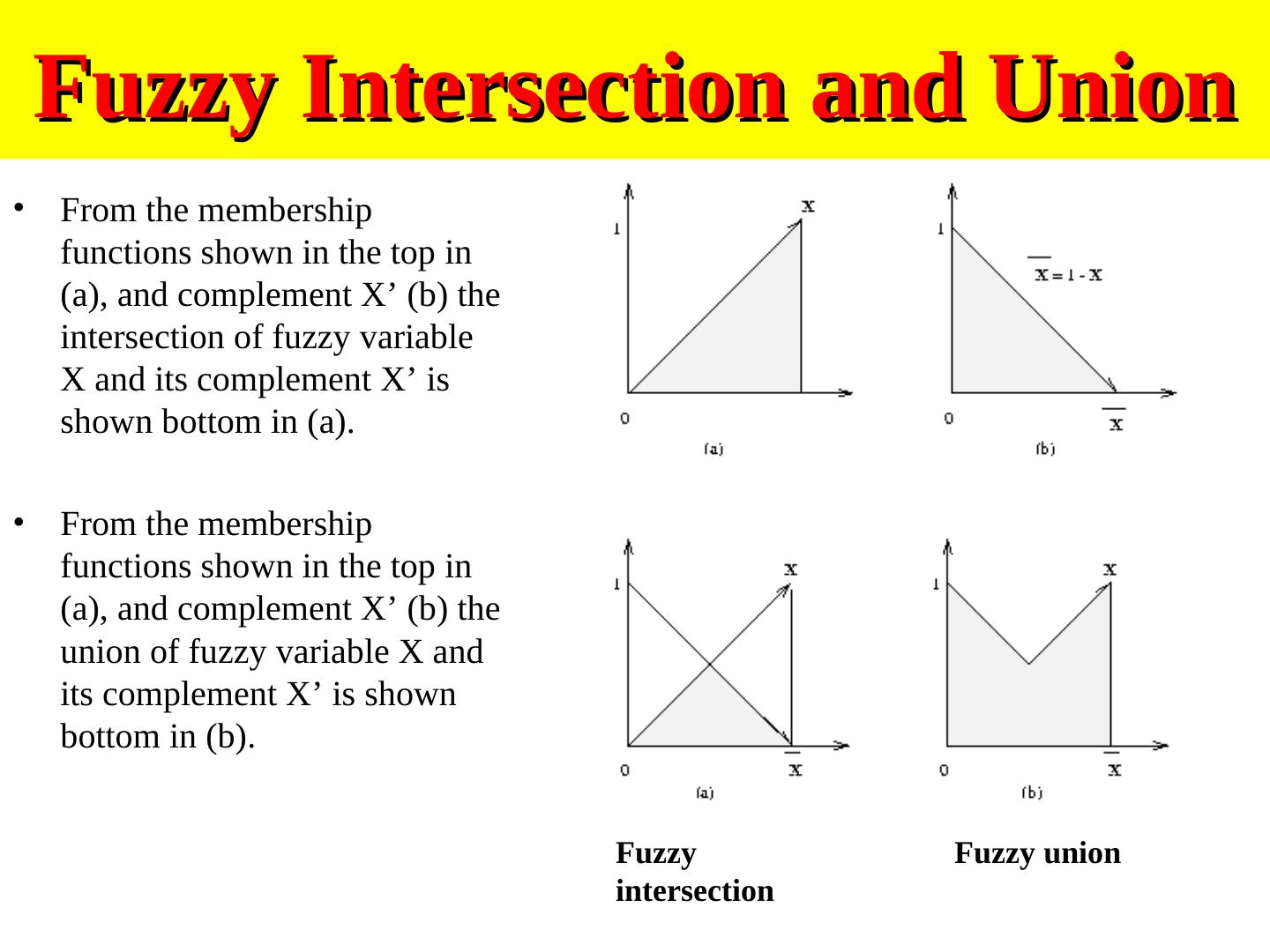 23 . Fuzzy Intersection and Union • From the membership functions shown in the top in (a), and complement X’ (b) the intersection of fuzzy variable X and its complement X’ is shown bottom in (a). • From the membership functions shown in the top in (a), and complement X’ (b) the union of fuzzy variable X and its complement X’ is shown bottom in (b). Fuzzy Fuzzy union intersection