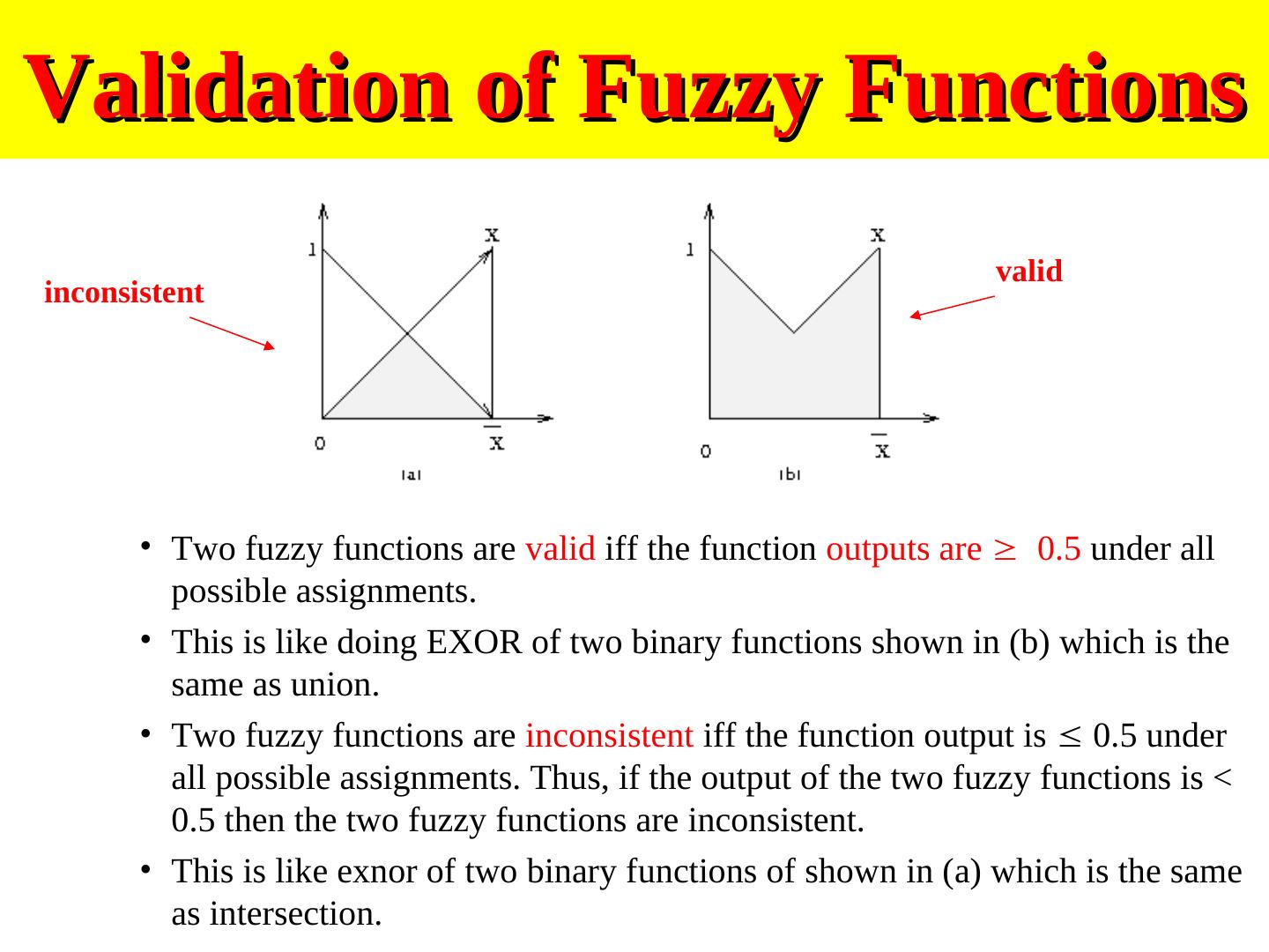 24 .Validation of Fuzzy Functions valid inconsistent • Two fuzzy functions are valid iff the function outputs are 0.5 under all possible assignments. • This is like doing EXOR of two binary functions shown in (b) which is the same as union. • Two fuzzy functions are inconsistent iff the function output is 0.5 under all possible assignments. Thus, if the output of the two fuzzy functions is < 0.5 then the two fuzzy functions are inconsistent. • This is like exnor of two binary functions of shown in (a) which is the same as intersection.