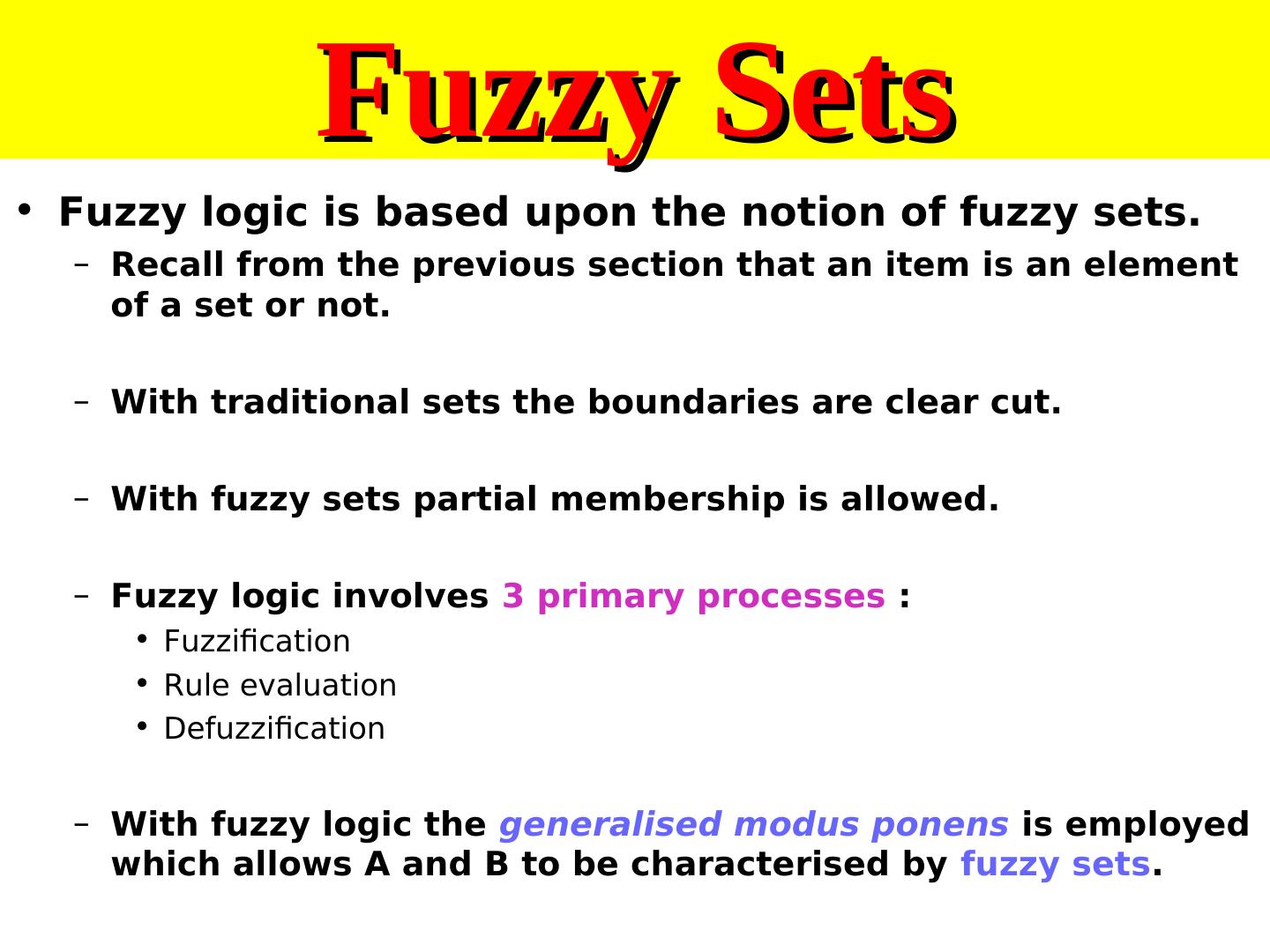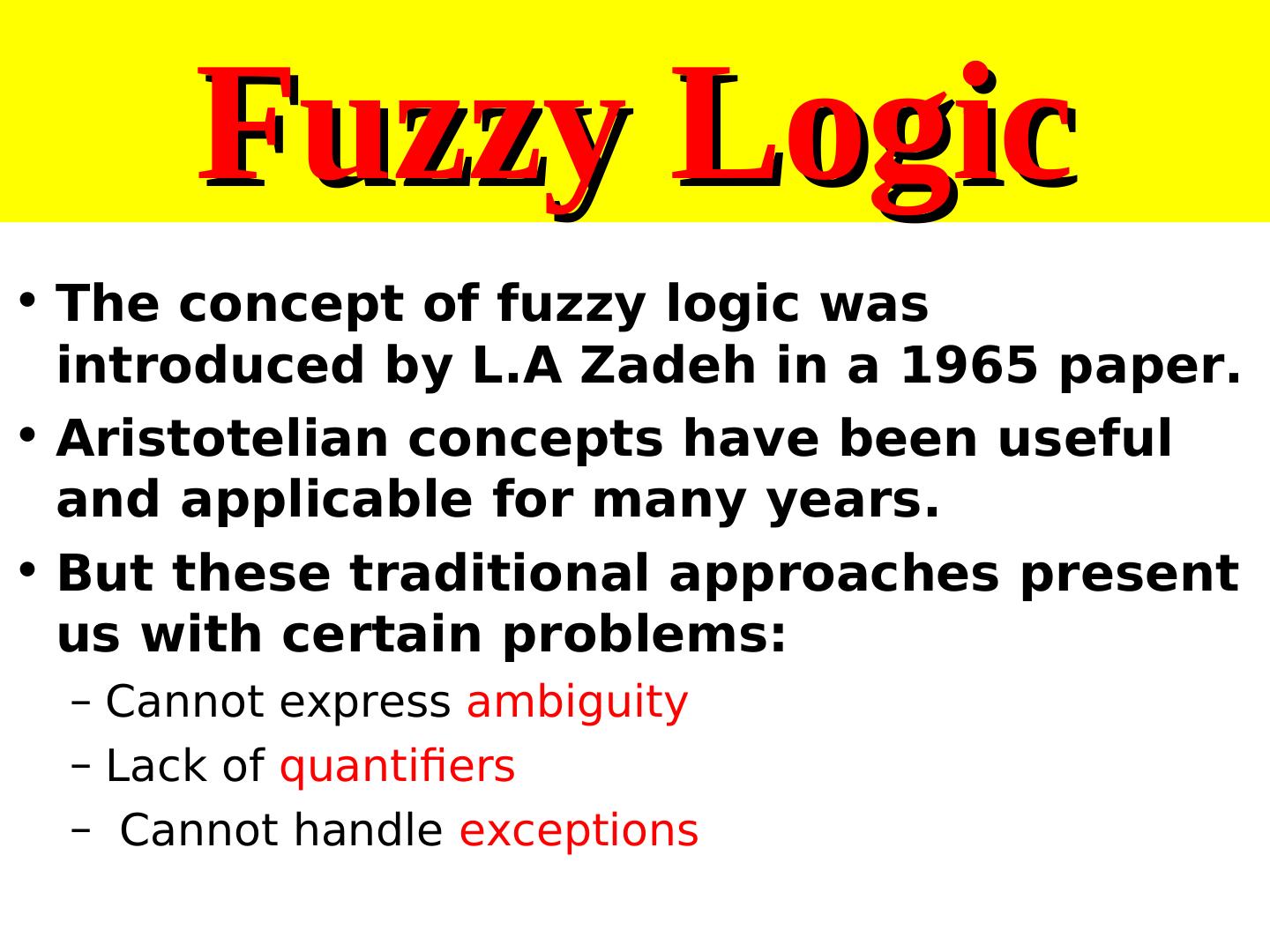 26 . Fuzzy Logic • The concept of fuzzy logic was introduced by L.A Zadeh in a 1965 paper. • Aristotelian concepts have been useful and applicable for many years. • B))ut these traditional approaches present us with certain problems: – Cannot express ambiguity – Lack of quantifiers – Cannot handle exceptions