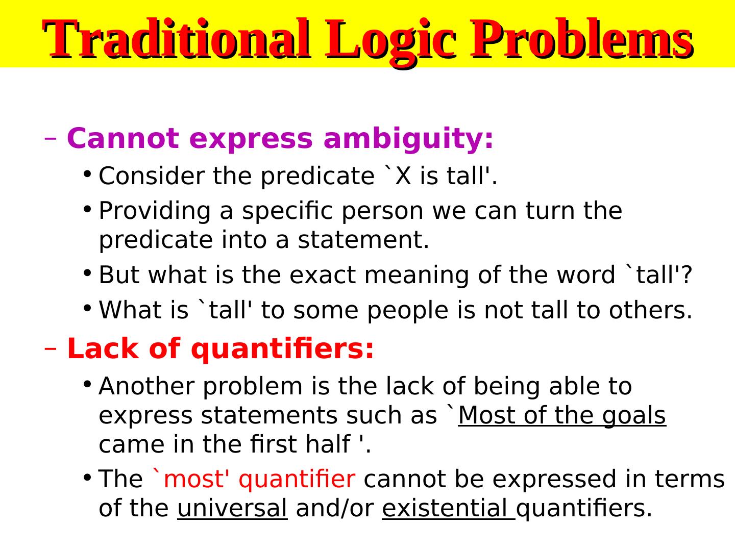 27 .Traditional Logic Problems – Cannot express ambiguity: • Consider the predicate `X is tall'. • Providing a specific person we can turn the predicate into a statement. • But what is the exact meaning of the word `tall'? • What is `tall' to some people is not tall to others. – Lack of quantifiers: • Another problem is the lack of being able to express statements such as `Most of the goals came in the first half '. • The `most' quantifier cannot be expressed in terms of the universal and/or existential quantifiers.