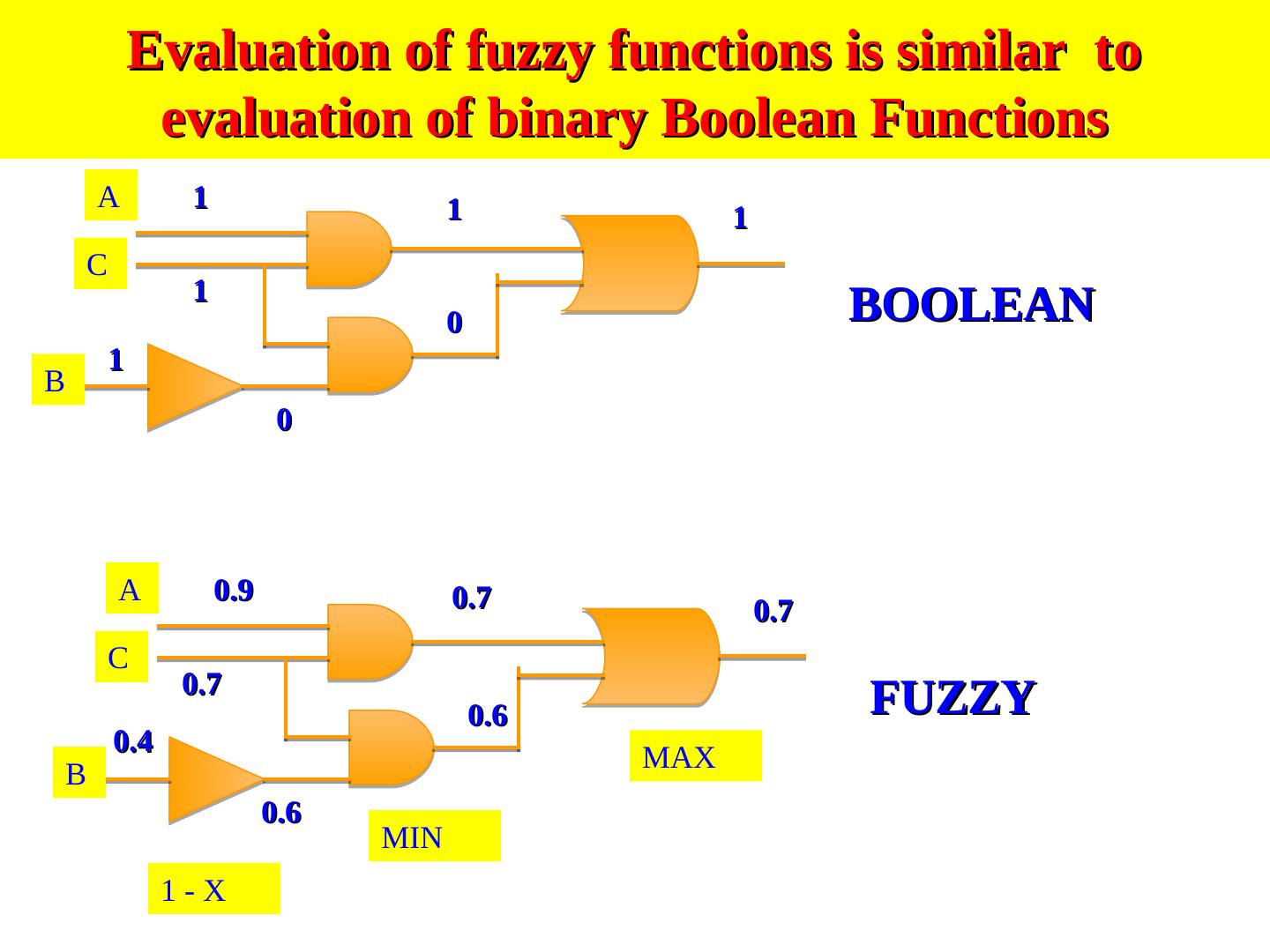 20 . Identities of Fuzzy Logic • The form of identities used in fuzzy variables are the same as elements in fuzzy sets. • The definition of an element in a fuzzy set, {(x,u a(x))}, is the same as a fuzzy variable x and this form will be used in the remainder of the paper. • Fuzzy functions are made up of fuzzy variables. The identities for fuzzy algebra are: Idempotency: X + X = X, X * X = X Commutativity: X + Y = Y + X, X * Y = Y * X Associativity: (X + Y) + Z = X + (Y + Z), (X * Y) * Z = X * (Y* Z) Absorption: X + (X * Y) = X, X * (X + Y) = X Distributivity: X + (Y * Z) = (X + Y) * (X + Z), X * (Y + Z) = (X * Y) + (X * Z) Complement: X’’ = X DeMorgan's Laws: (X + Y)’ = X’ * Y’, (X * Y)’ = X’ + Y’