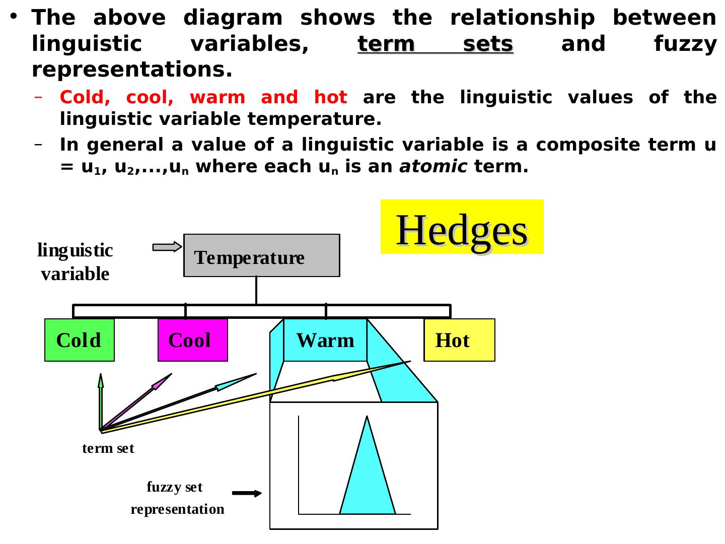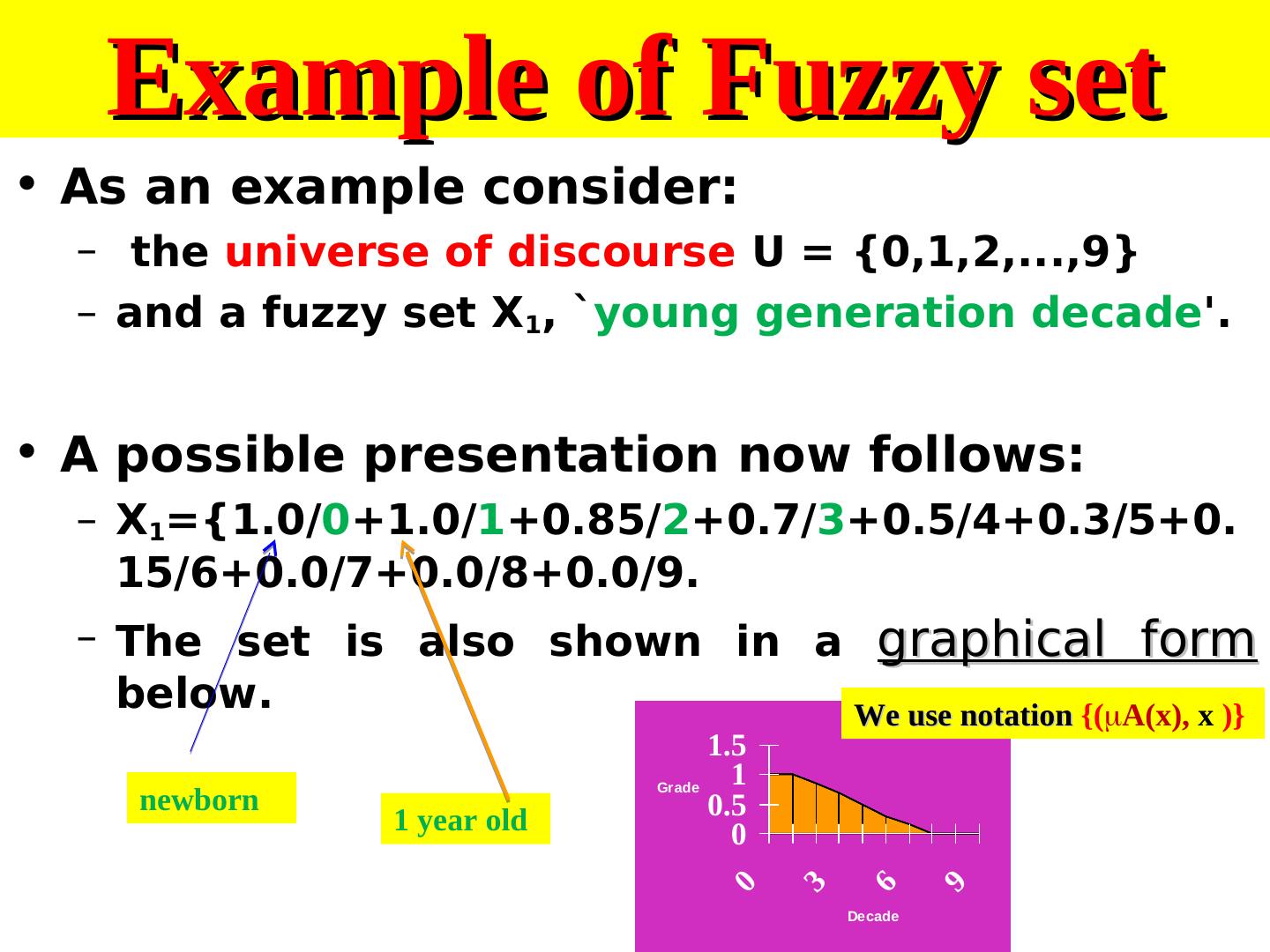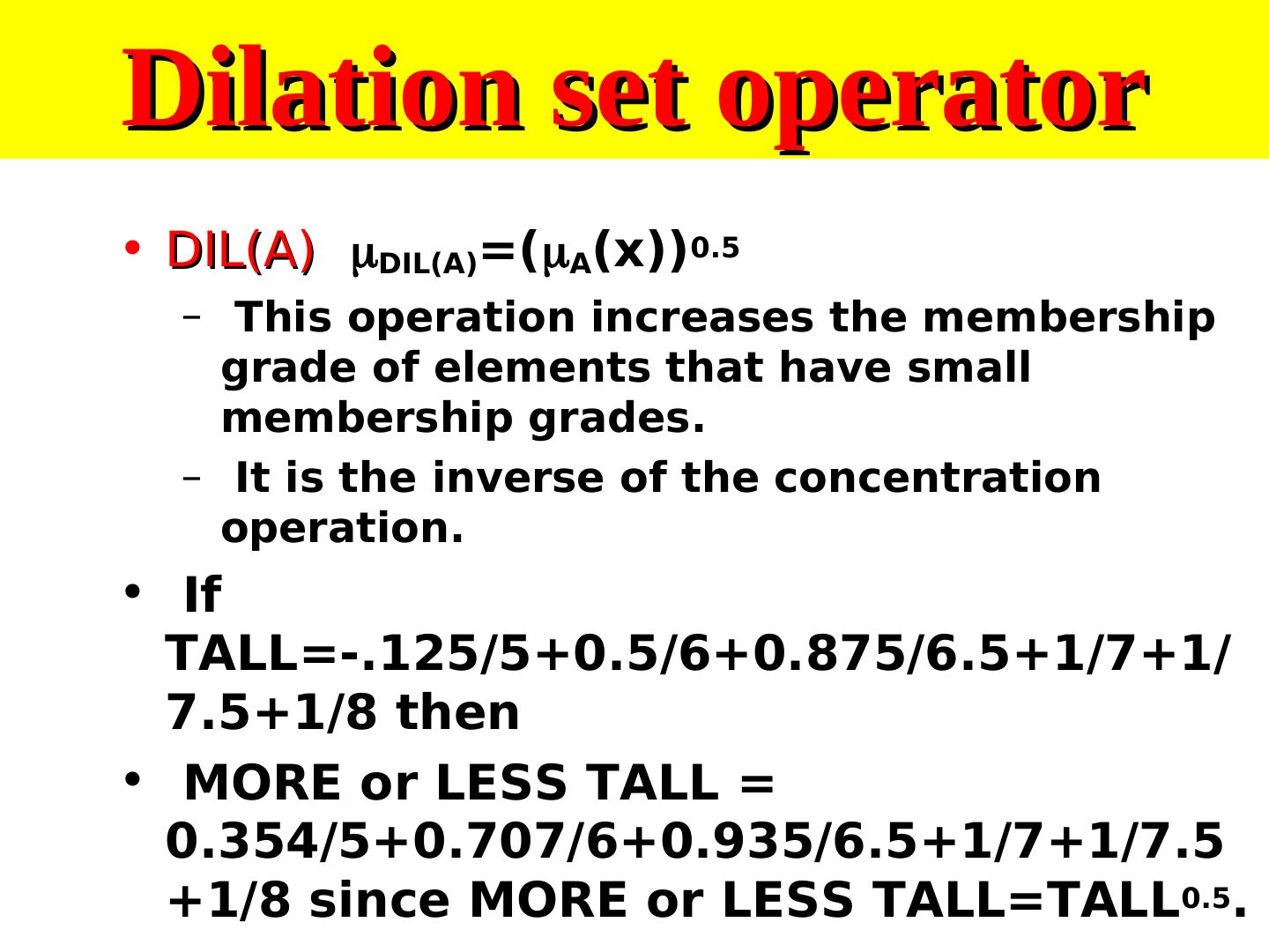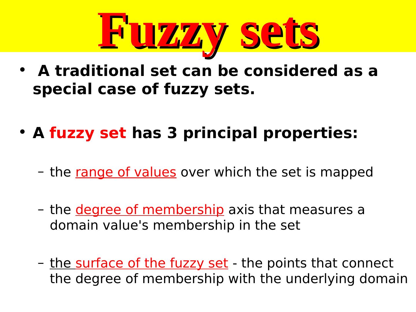 5 .• In traditional logic, statements can be either true or false, and sets can either contain an element or not. • These logic values and set memberships are typically represented with number 1 and 0. • Fuzzy logic generalizes traditional logic by allowing statements to be somewhat true, partially true, etc. • Likewise, sets can have full members, tall partial members, and so on. • For example, a person whose height is 5’ 9” might be assigned a medium membership of 0.6 in the fuzzy set “tall people”. • The statement “Joe is tall” is 60% true of Joe is 5’9”. • Fuzzy logic is a set of “if--then” statements based on combining fuzzy sets. (Beale & Demuth..Fuzzy Systems Toolbox.)