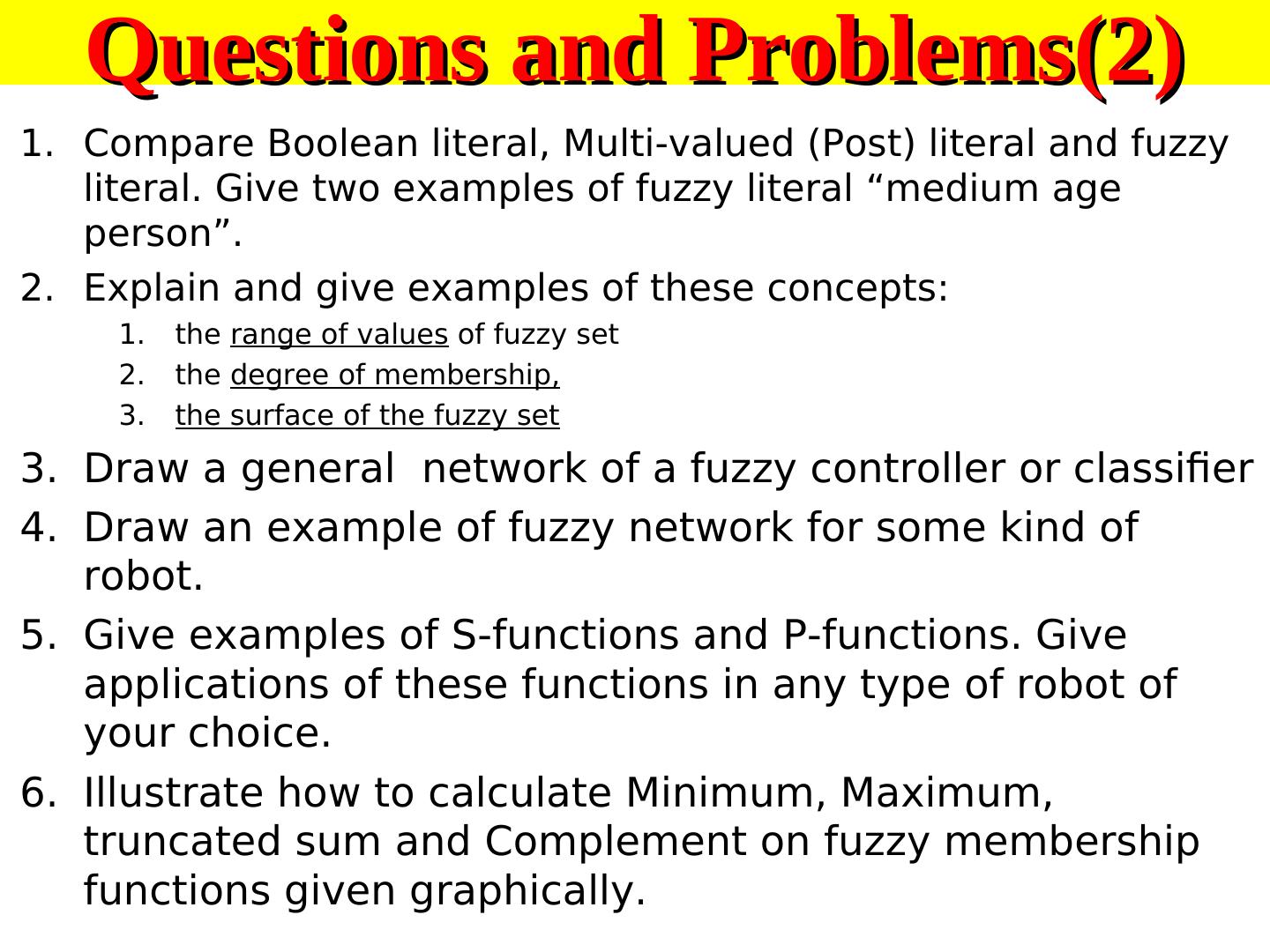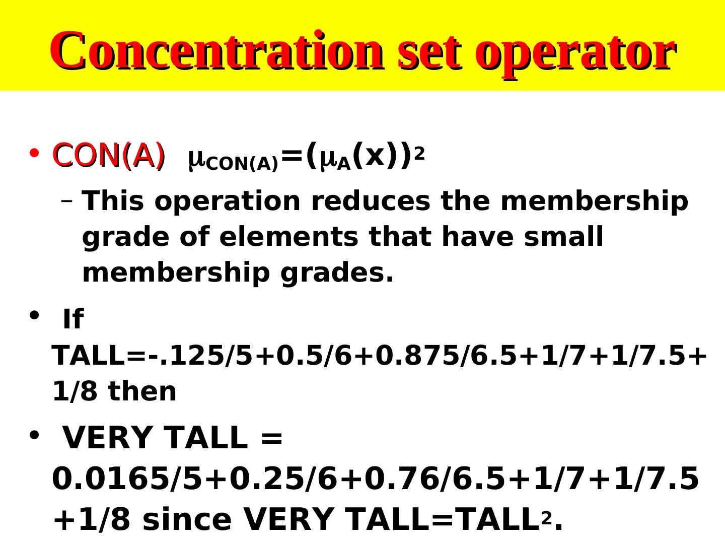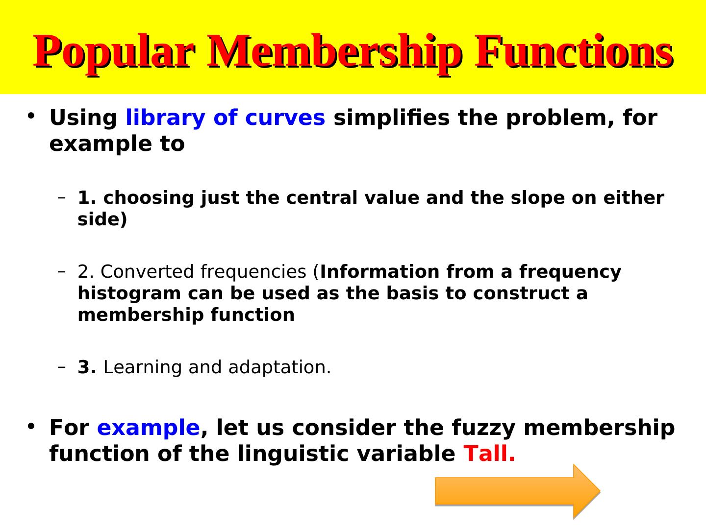 5 .• In traditional logic, statements can be either true or false, and sets can either contain an element or not. • These logic values and set memberships are typically represented with number 1 and 0. • Fuzzy logic generalizes traditional logic by allowing statements to be somewhat true, partially true, etc. • Likewise, sets can have full members, tall partial members, and so on. • For example, a person whose height is 5’ 9” might be assigned a medium membership of 0.6 in the fuzzy set “tall people”. • The statement “Joe is tall” is 60% true of Joe is 5’9”. • Fuzzy logic is a set of “if--then” statements based on combining fuzzy sets. (Beale & Demuth..Fuzzy Systems Toolbox.)
