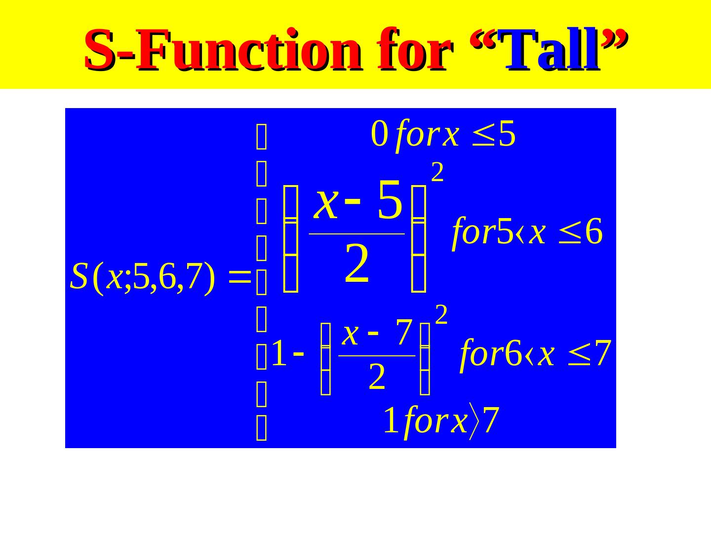 6 . Fuzzy Sets, Statements, and Rules • A crisp set is simply a collection of objects taken from the universe of objects. • Fuzzy refers to linguistic uncertainty, like the word “tall”. • Fuzzy sets allow objects to have membership in more than one set: – e.g. 6’ 0” has grade 70% in the set “tall” and grade 40% in the set “medium”. • A fuzzy statement describes the grade of a fuzzy variable with an expression: – e.g. Pick a real number greater than 3 and less than 8.