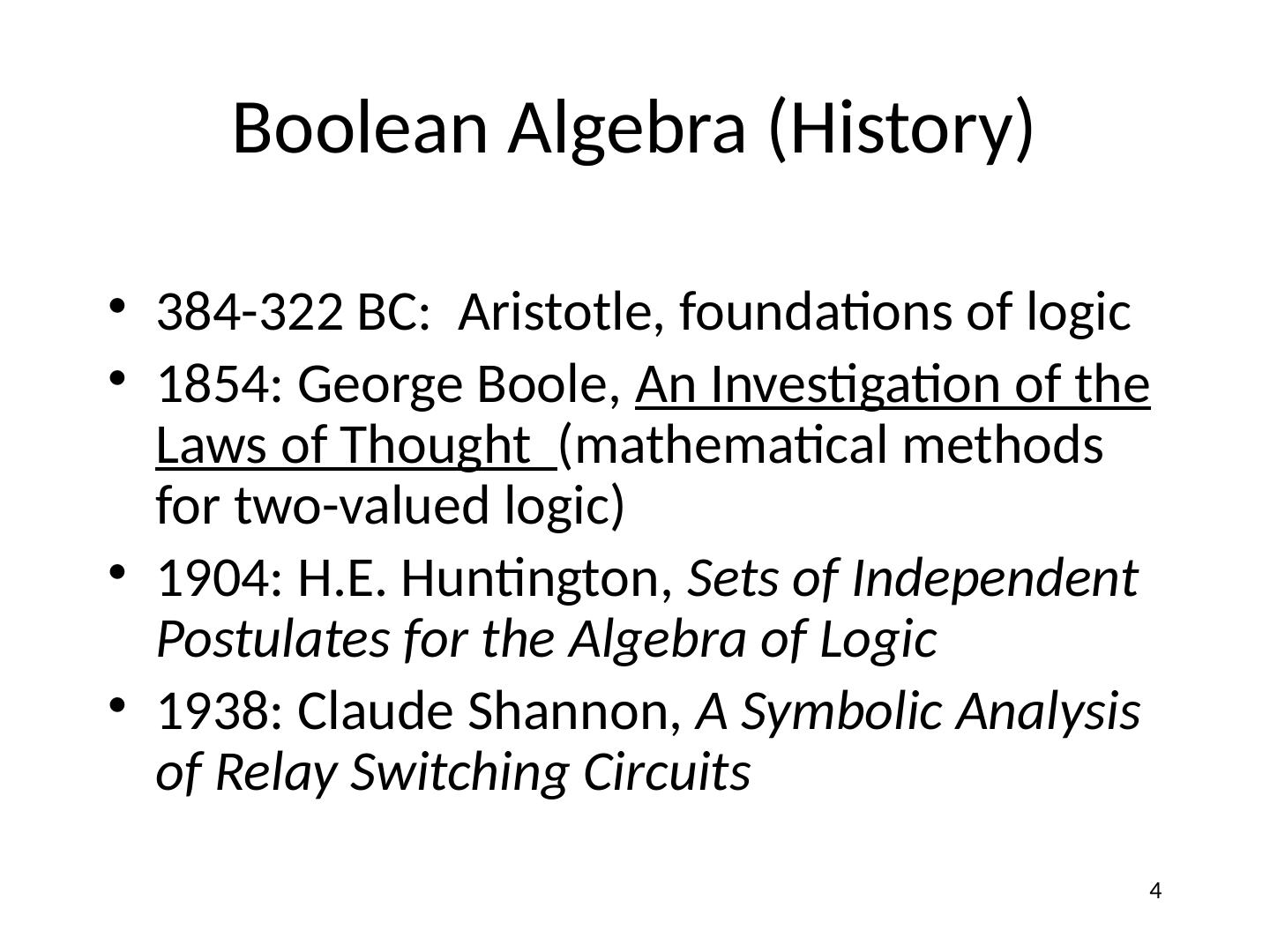 4 .Boolean Algebra (History) 384-322 BC: Aristotle, foundations of logic 1854: George Boole, An Investigation of the Laws of Thought (mathematical methods for two-valued logic) 1904: H.E. Huntington, Sets of Independent Postulates for the Algebra of Logic 1938: Claude Shannon, A Symbolic Analysis of Relay Switching Circuits 4