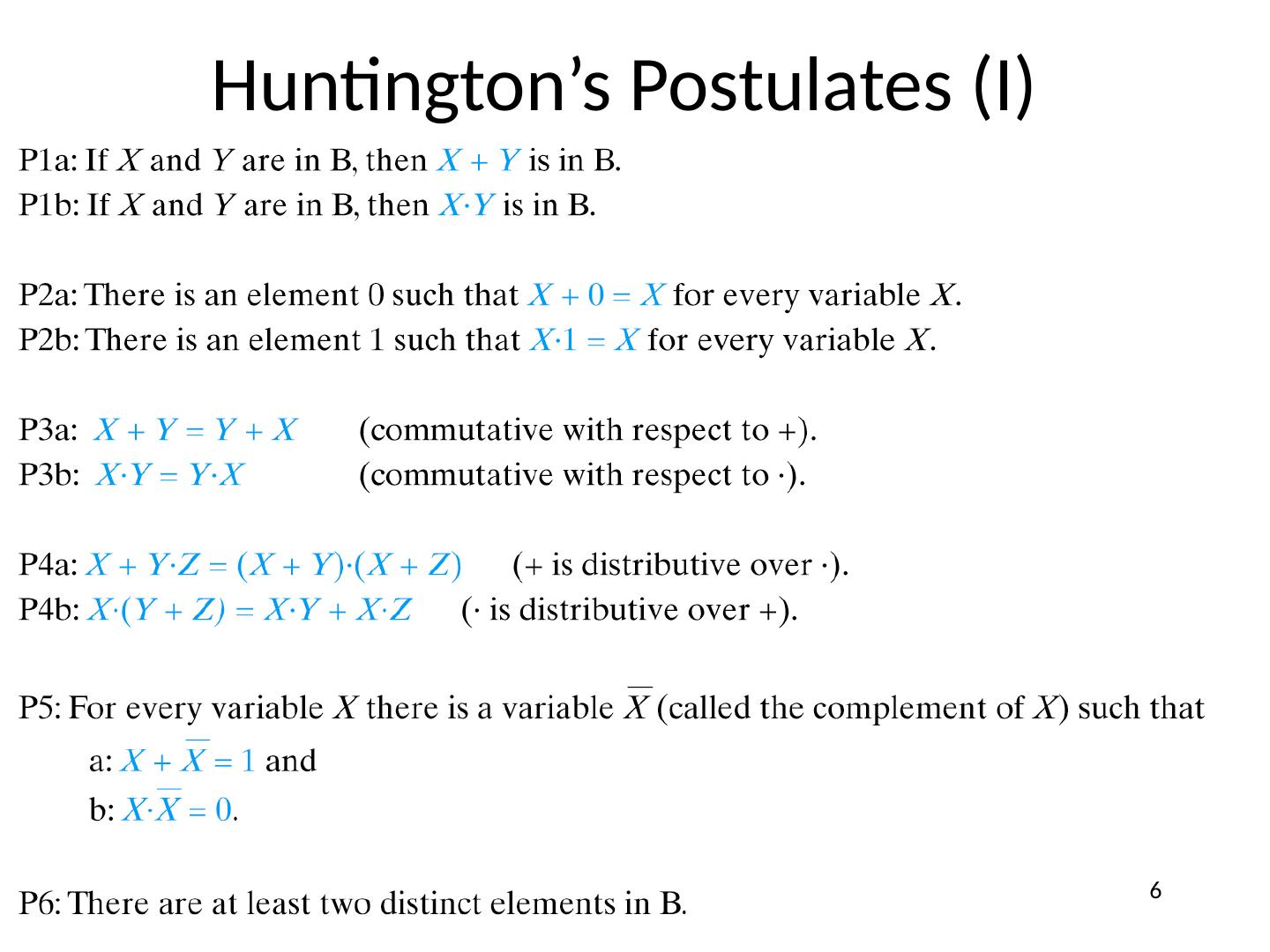 5 .Boolean Algebra Postulates (Axioms) Accepted as true; Foundation for further proofs Values B = {0, 1} Variables A,B,C X,Y,Z Ready, Green, OverWeightLimit Operators + × Additional Operators () = 5