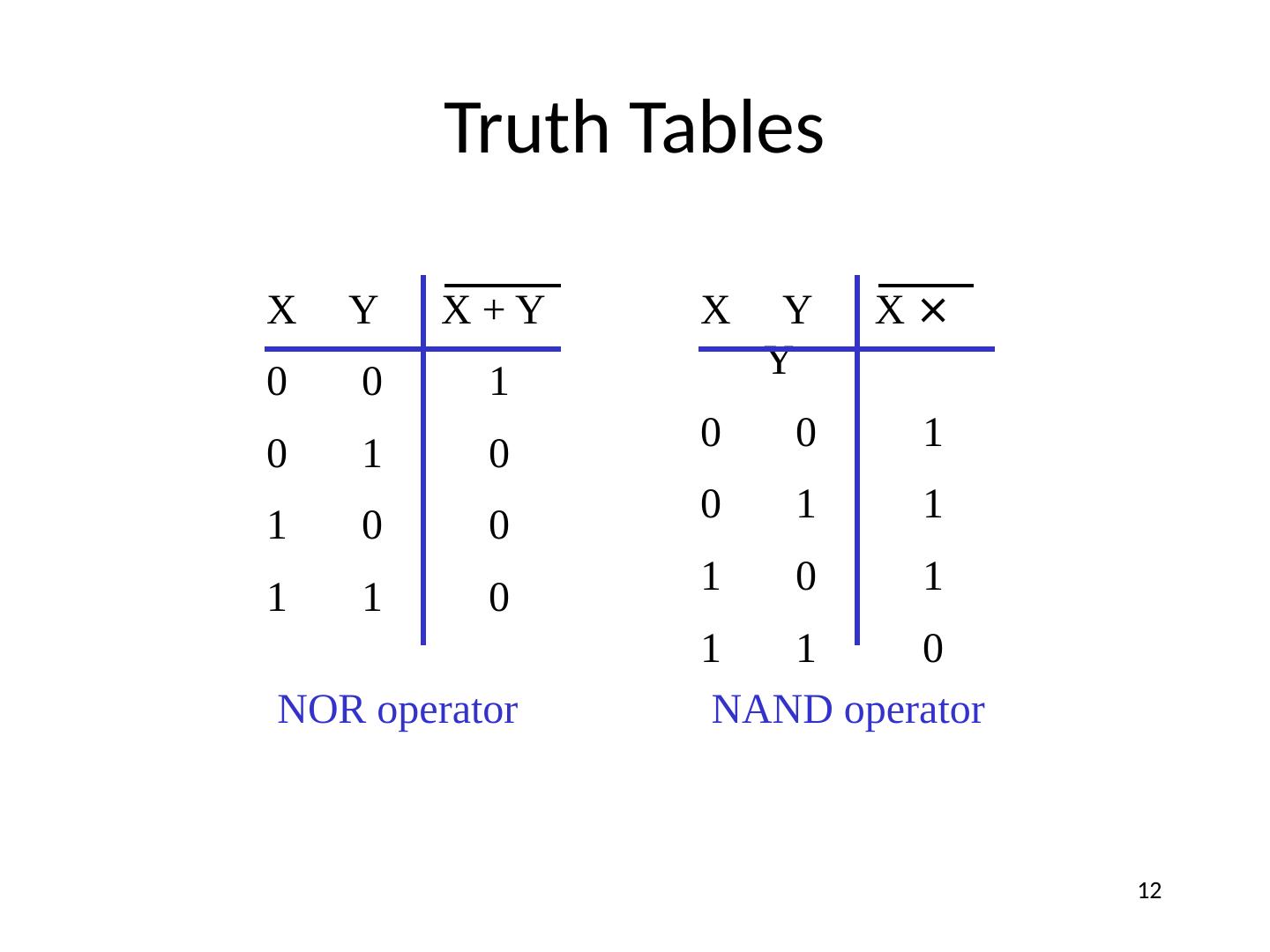 12 .Truth Tables NOR operator NAND operator X Y X + Y 0 0 1 0 1 0 1 0 0 1 1 0 X Y X × Y 0 0 1 0 1 1 1 0 1 1 1 0 12