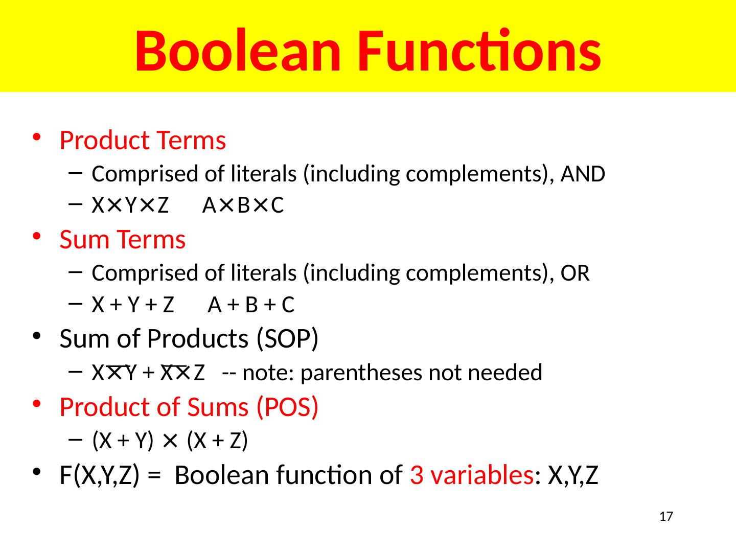 17 .Boolean Functions Product Terms Comprised of literals (including complements), AND X × Y × Z A × B × C Sum Terms Comprised of literals (including complements), OR X + Y + Z A + B + C Sum of Products (SOP) X × Y + X × Z -- note: parentheses not needed Product of Sums (POS) (X + Y) × (X + Z) F(X,Y,Z) = Boolean function of 3 variables : X,Y,Z 17