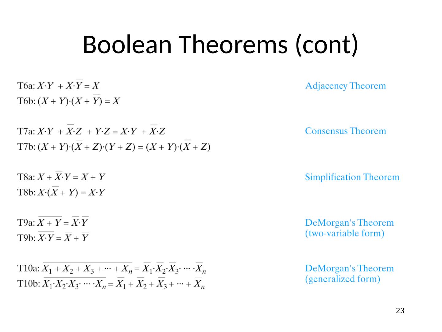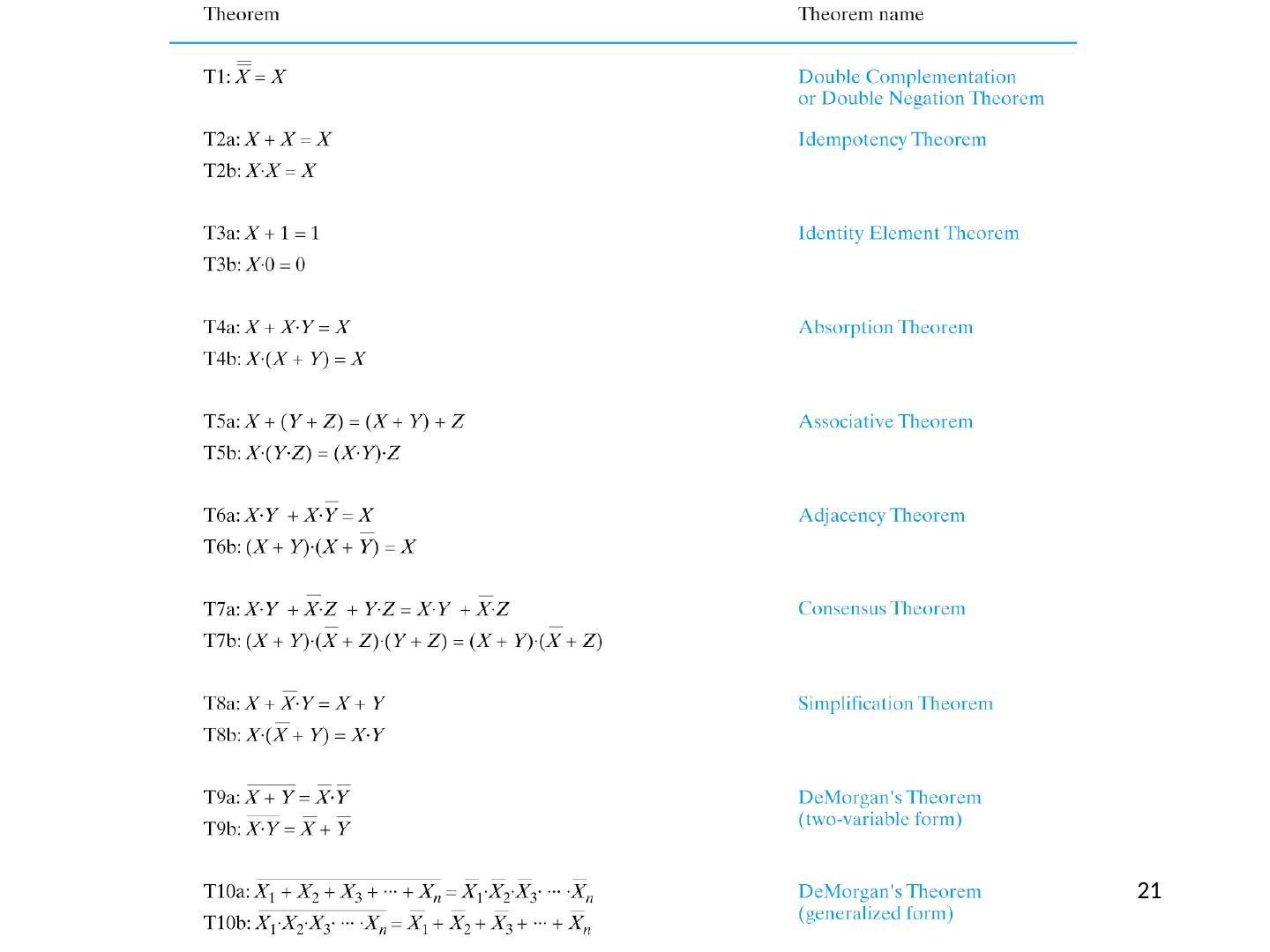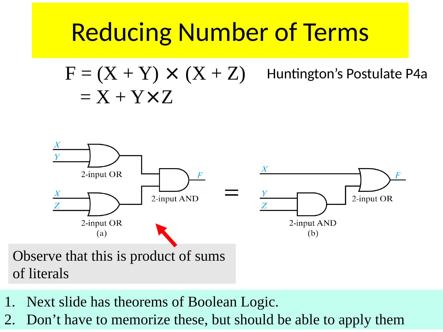20 .Reducing Number of Terms F = (X + Y) × (X + Z) = X + Y × Z Huntington’s Postulate P4a 20 Next slide has theorems of Boolean Logic. Don’t have to memorize these, but should be able to apply them Observe that this is product of sums of literals