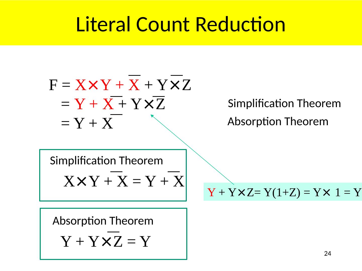 24 .Literal Count Reduction F = X × Y + X + Y × Z = Y + X + Y × Z = Y + X Simplification Theorem Absorption Theorem Simplification Theorem Absorption Theorem X × Y + X = Y + X Y + Y × Z = Y 24 Y + Y × Z= Y(1+Z) = Y × 1 = Y