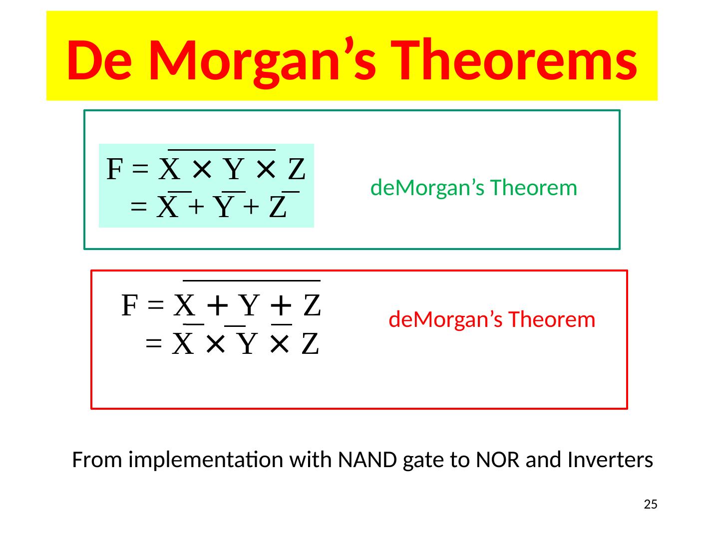 25 .De Morgan’s Theorems F = X × Y × Z = X + Y + Z deMorgan’s Theorem From implementation with NAND gate to NOR and Inverters 25 F = X + Y + Z = X × Y × Z deMorgan’s Theorem