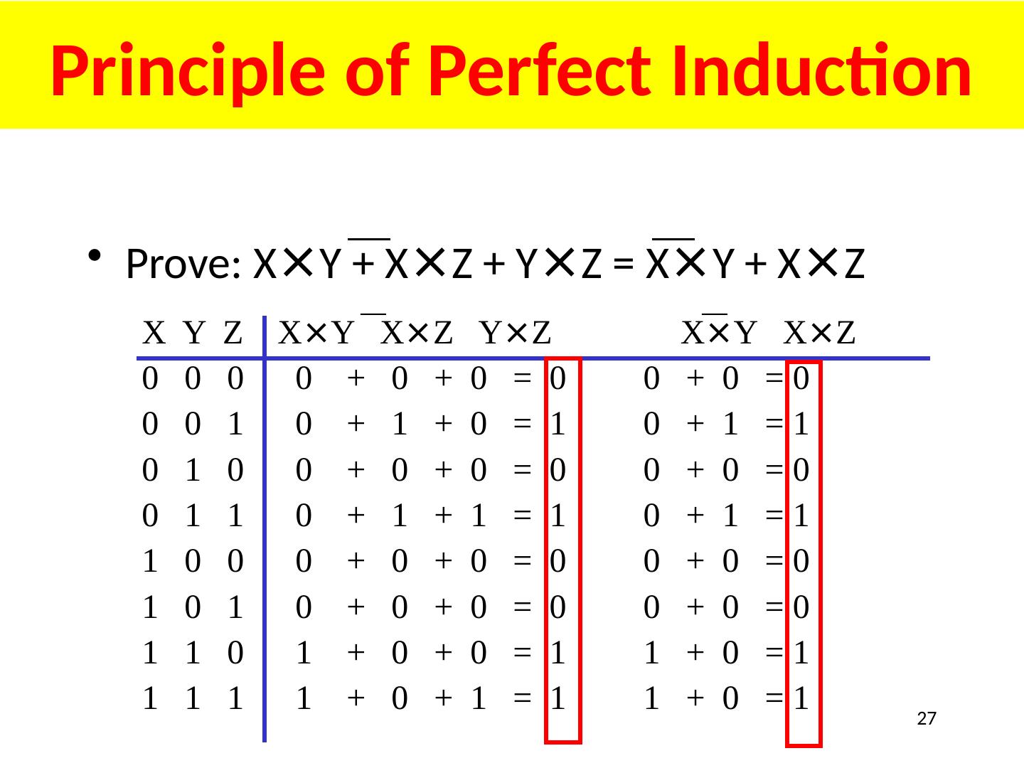 27 .Principle of Perfect Induction Prove: X × Y + X × Z + Y × Z = X × Y + X × Z X Y Z X × Y X × Z Y × Z X × Y X × Z 0 0 0 0 + 0 + 0 = 0 0 + 0 = 0 0 0 1 0 + 1 + 0 = 1 0 + 1 = 1 0 1 0 0 + 0 + 0 = 0 0 + 0 = 0 0 1 1 0 + 1 + 1 = 1 0 + 1 = 1 1 0 0 0 + 0 + 0 = 0 0 + 0 = 0 1 0 1 0 + 0 + 0 = 0 0 + 0 = 0 1 1 0 1 + 0 + 0 = 1 1 + 0 = 1 1 1 1 1 + 0 + 1 = 1 1 + 0 = 1 27