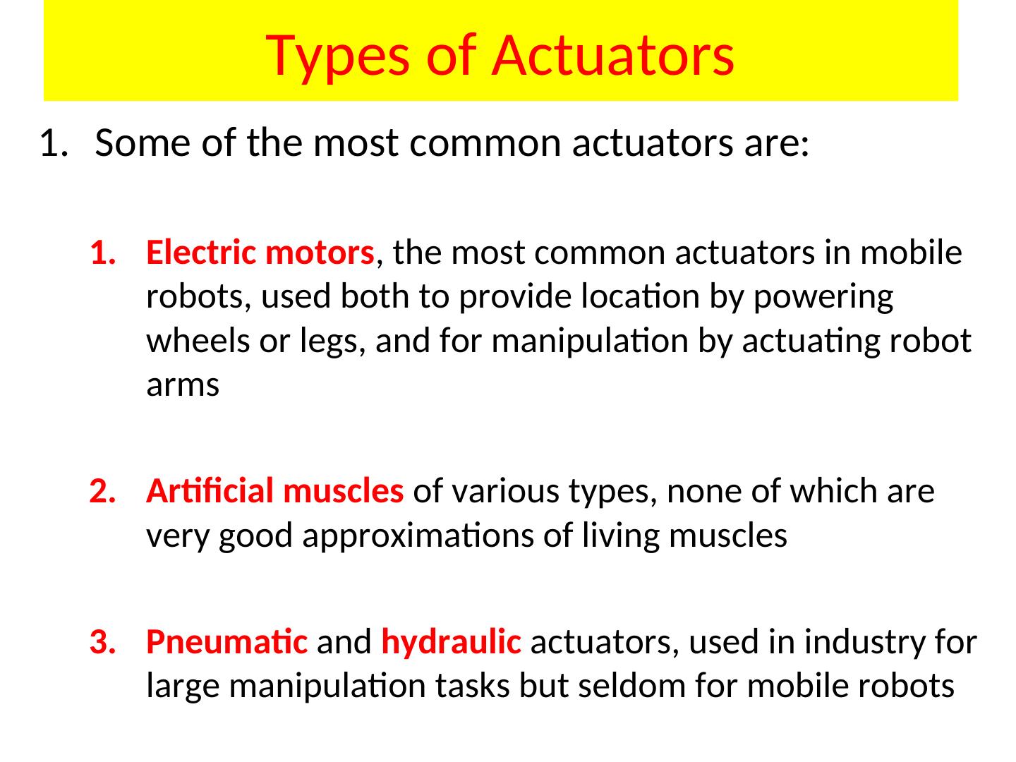 7 . Types of Actuators 1. Some of the most common actuators are: 1. Electric motors, the most common actuators in mobile robots, used both to provide location by powering wheels or legs, and for manipulation by actuating robot arms 2. Artificial muscles of various types, none of which are very good approximations of living muscles 3. Pneumatic and hydraulic actuators, used in industry for large manipulation tasks but seldom for mobile robots