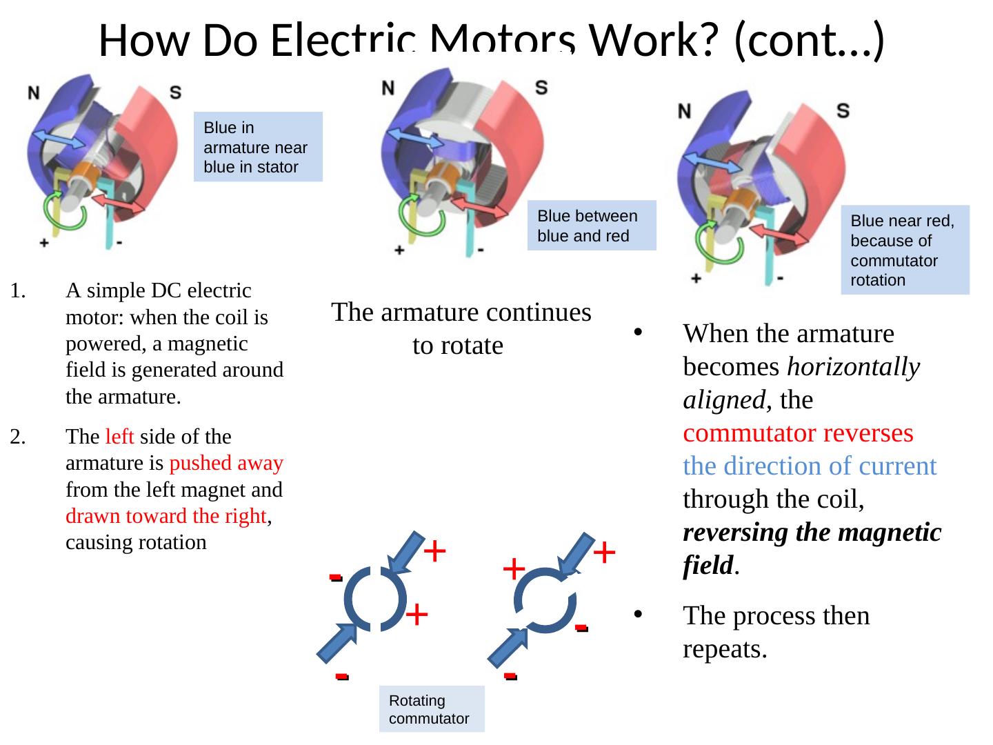 18 . How Do Electric Motors Work? (cont…) Blue in armature near blue in stator Blue between Blue near red, blue and red because of commutator rotation 1. A simple DC electric motor: when the coil is The armature continues powered, a magnetic to rotate • When the armature field is generated around becomes horizontally the armature. aligned, the 2. The left side of the commutator reverses armature is pushed away the direction of current from the left magnet and through the coil, drawn toward the right, reversing the magnetic causing rotation + + + - field. + - • The process then repeats. - Rotating - commutator