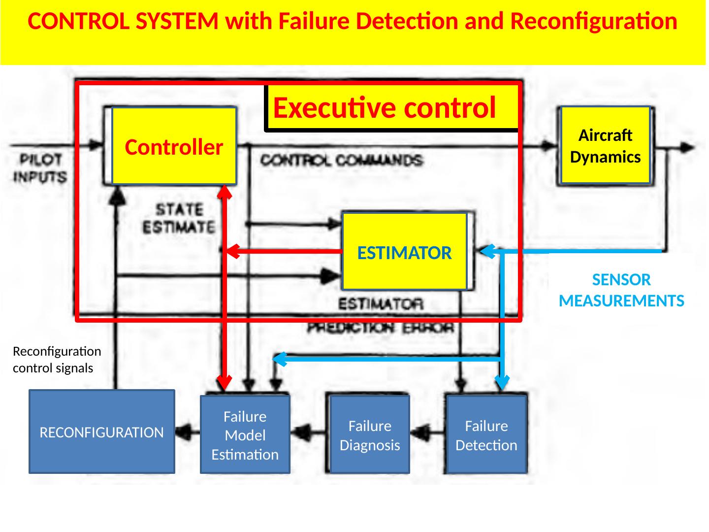 12 .CONTROL SYSTEM with Failure Detection and Reconfiguration Executive control Aircraft Dynamics Controller ESTIMATOR SENSOR MEASUREMENTS Reconfiguration control signals Failure Detection Failure Diagnosis Failure Model Estimation RECONFIGURATION