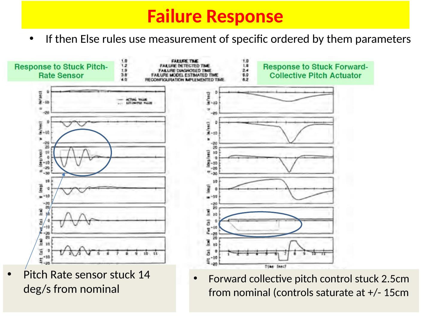 18 .Failure Response If then Else rules use measurement of specific ordered by them parameters Pitch Rate sensor stuck 14 deg /s from nominal Forward collective pitch control stuck 2.5cm from nominal (controls saturate at +/- 15cm