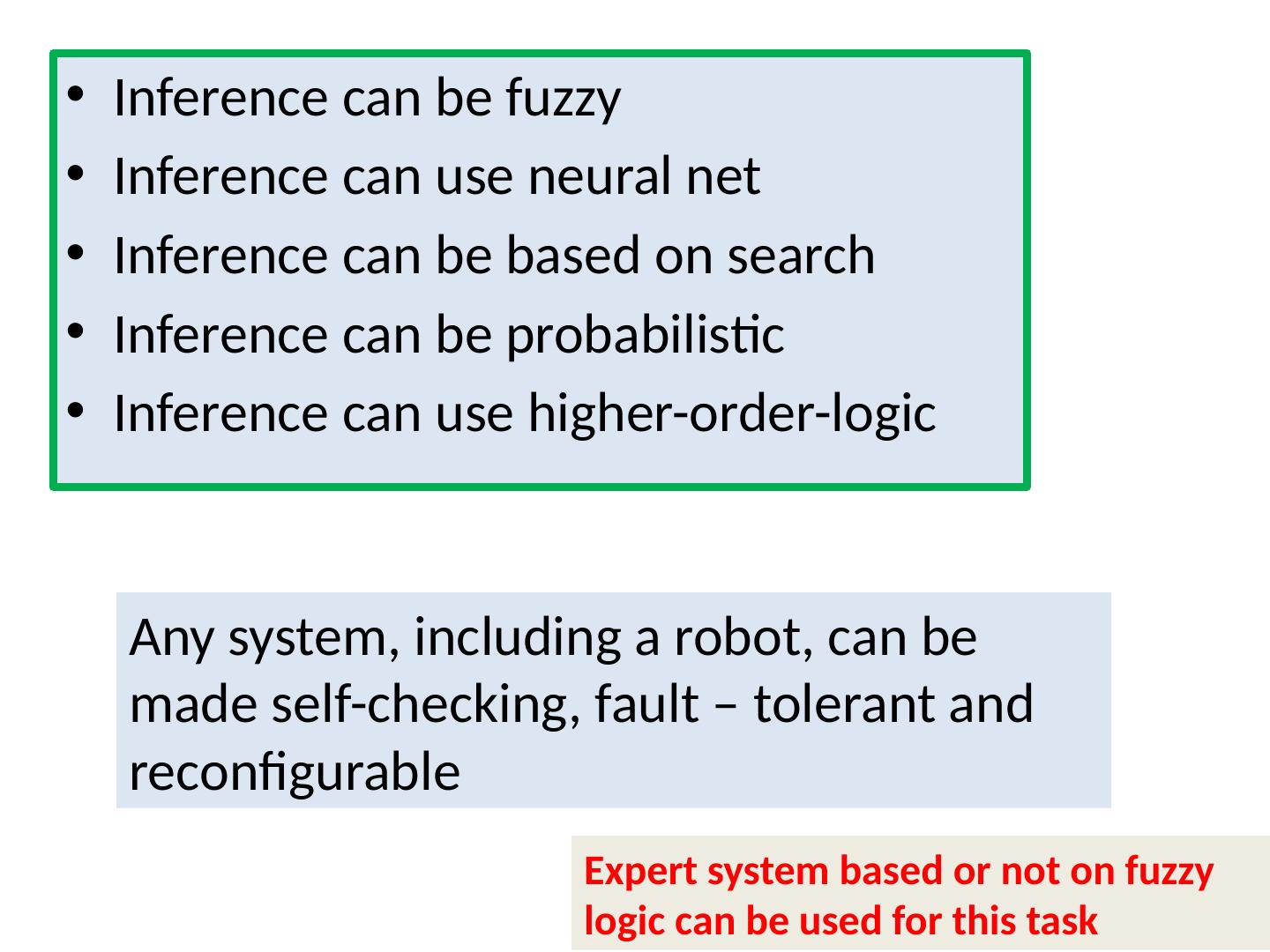 19 .Inference can be fuzzy Inference can use neural net Inference can be based on search Inference can be probabilistic Inference can use higher-order-logic Any system, including a robot, can be made self-checking, fault – tolerant and reconfigurable Expert system based or not on fuzzy logic can be used for this task