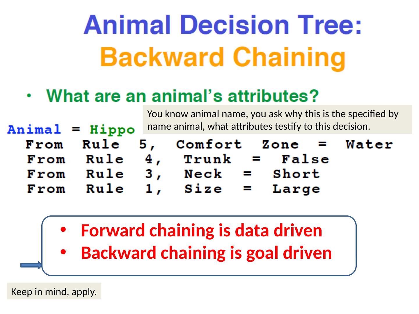 27 .Forward chaining is data driven Backward chaining is goal driven You know animal name, you ask why this is the specified by name animal, what attributes testify to this decision. Keep in mind, apply.