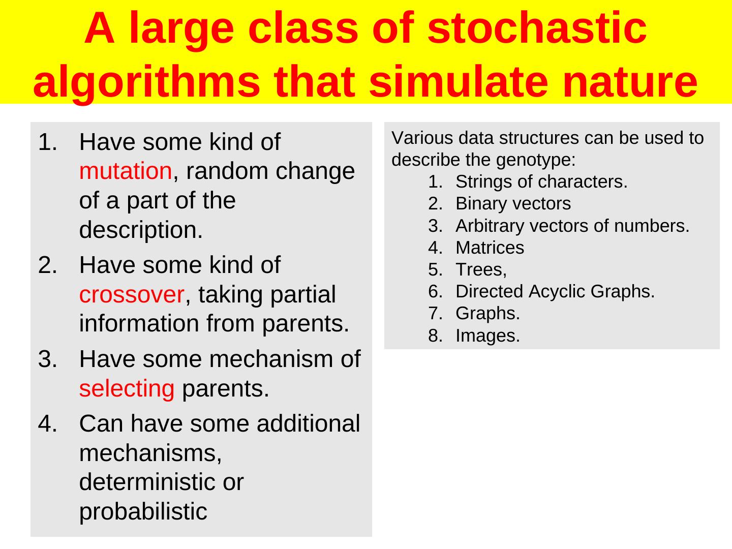 2 . A large class of stochastic algorithms that simulate nature 1. Have some kind of Various data structures can be used to describe the genotype: mutation, random change 1. Strings of characters. of a part of the 2. Binary vectors description. 3. Arbitrary vectors of numbers. 4. Matrices 2. Have some kind of 5. Trees, crossover, taking partial 6. Directed Acyclic Graphs. 7. Graphs. information from parents. 8. Images. 3. Have some mechanism of selecting parents. 4. Can have some additional mechanisms, deterministic or probabilistic