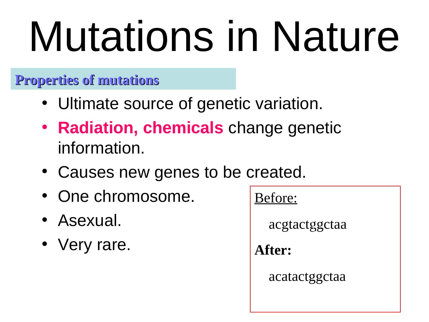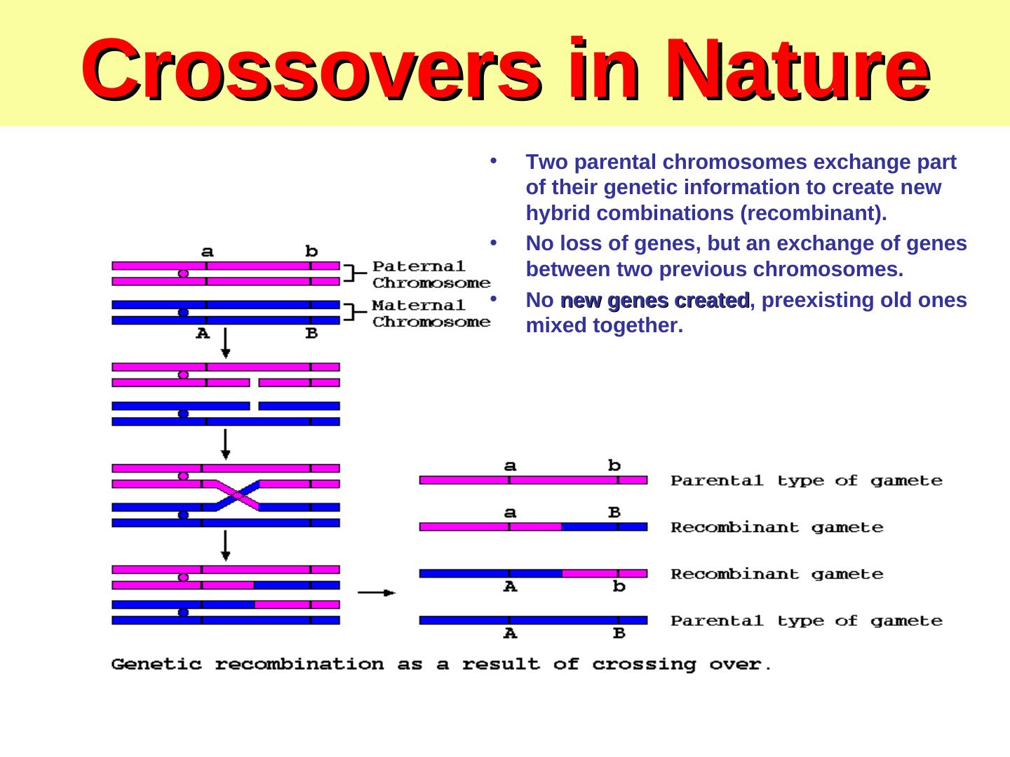 3 .Crossovers in Nature • Two parental chromosomes exchange part of their genetic information to create new hybrid combinations (recombinant). • No loss of genes, but an exchange of genes between two previous chromosomes. • No new genes created, created preexisting old ones mixed together.
