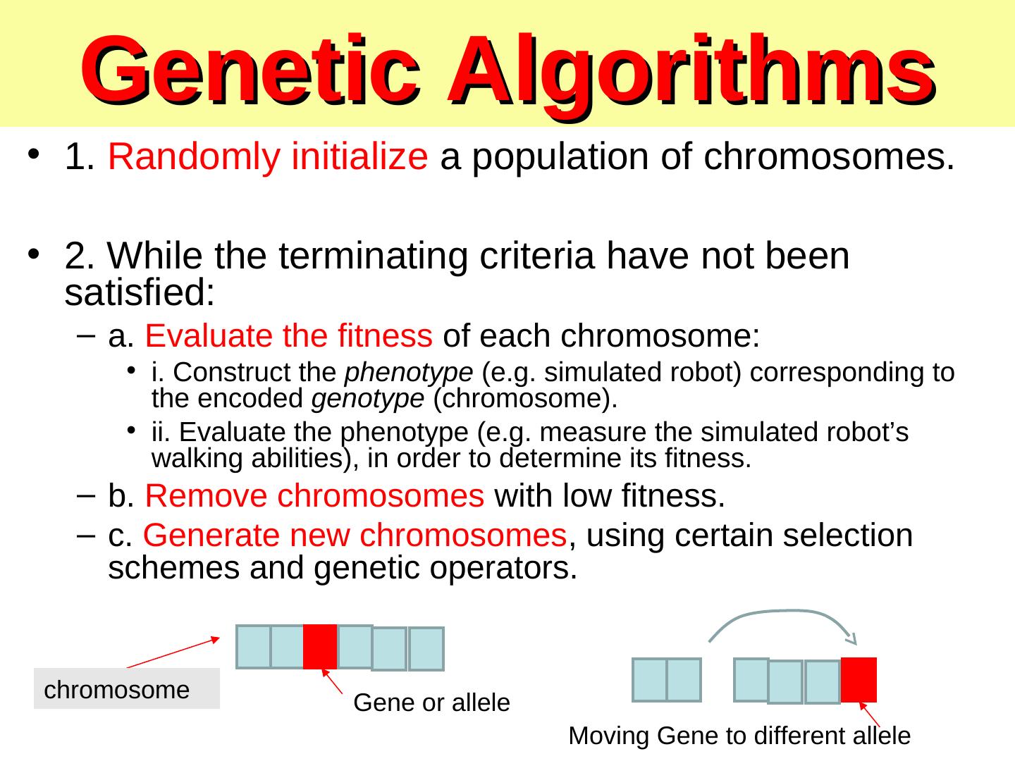 6 . Genetic Algorithms • 1. Randomly initialize a population of chromosomes. • 2. While the terminating criteria have not been satisfied: – a. Evaluate the fitness of each chromosome: • i. Construct the phenotype (e.g. simulated robot) corresponding to the encoded genotype (chromosome). • ii. Evaluate the phenotype (e.g. measure the simulated robot’s walking abilities), in order to determine its fitness. – b. Remove chromosomes with low fitness. – c. Generate new chromosomes, using certain selection schemes and genetic operators. chromosome Gene or allele Moving Gene to different allele